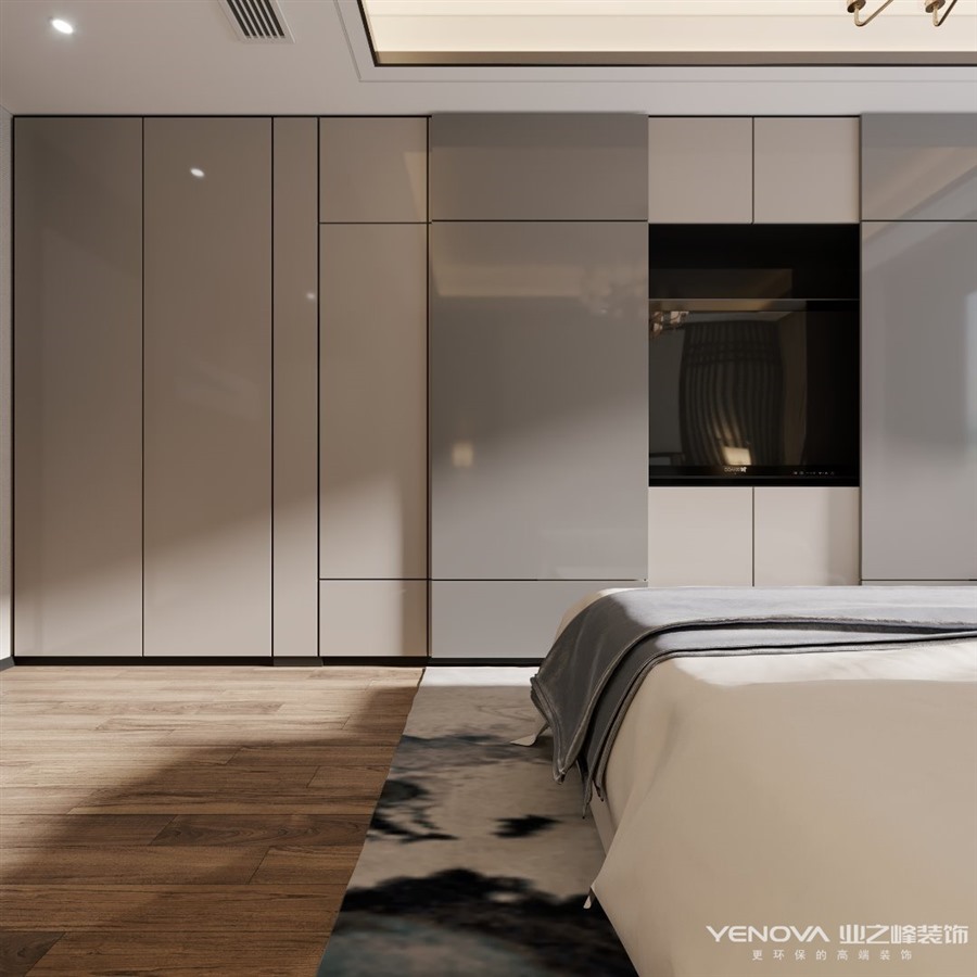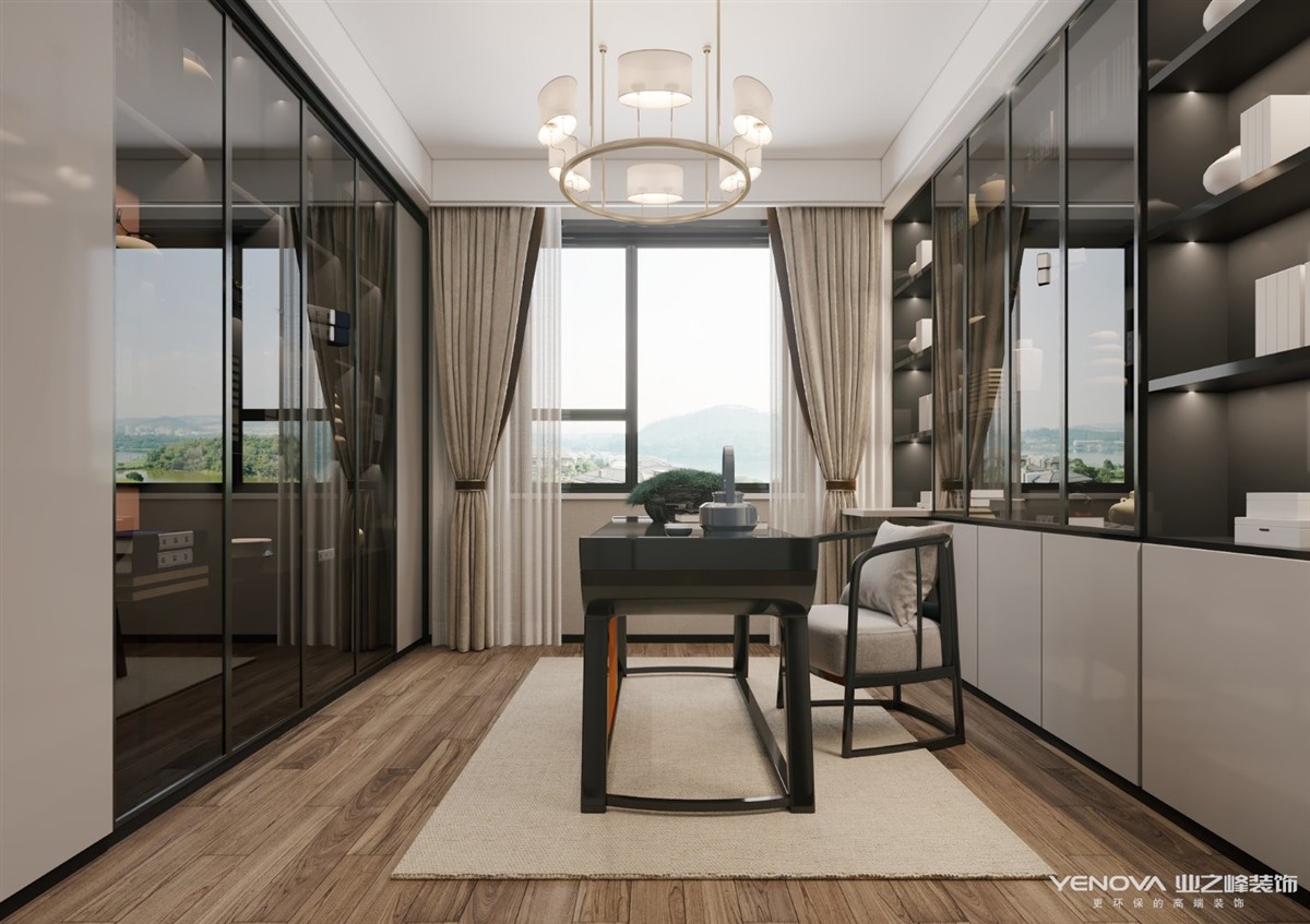 此方案定位为新中式风格,空间的色调更多的选用了比较素雅的米白、浅啡等一些色块。客厅则通过深沉暗雅的颜色过渡,加入一些红色点缀,使空间沉稳大气。餐厅的整体格调,给人一种浓厚的文化韵味。半开放式书房,前后两面墙都设了整排柜子,大量的玻璃门让空间不显压抑。主卧的色调选用了沉稳的灰调,让空间温馨、舒适。小孩房更多的考虑了舒适性,色彩也相对活跃。