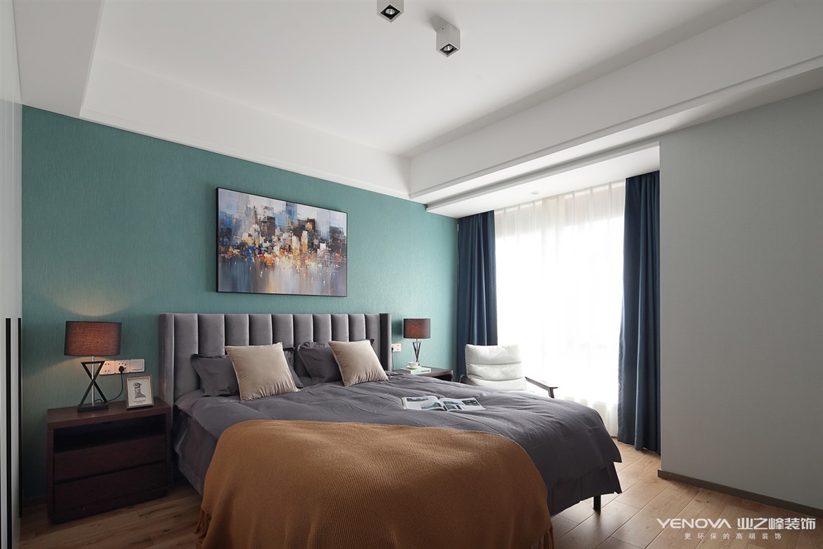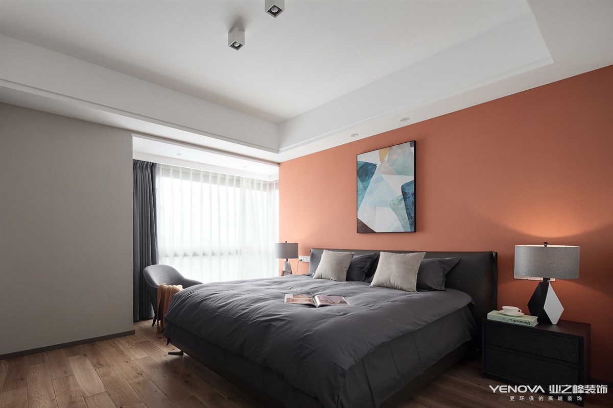 主卧室以自然舒适为主,家具多采用手工质感的肌理,清新简约的衣柜包括衣物收纳和抽屉收纳,精简细节也能构筑温馨生活,飘窗天生富有文艺的感觉,活力橙色的抱枕为居室更添一份绝美诱惑。