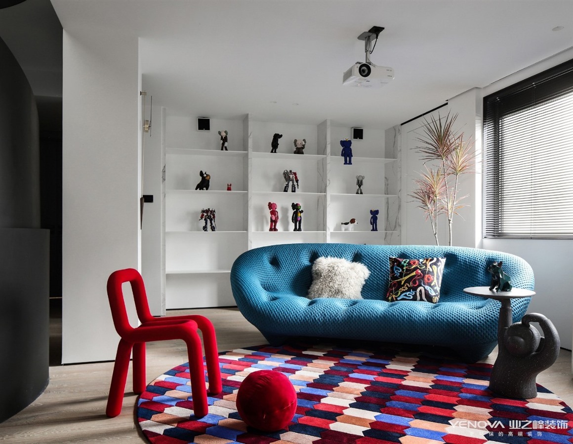 联通的客厅呈现出开阔、双倍的空间,更获得了双倍的光线和景致,通透明亮。为了消化承重的立柱,以瓷砖和白色乳胶漆围覆,形成明亮、多元的居家动线。客厅是这个家庭的生活重心,开放、流动的手法糅合充足的采光。空间用色干净、简约,层次分明。白色、蓝色两种主题色相得益彰,身处其间,让人不禁放松、静心。