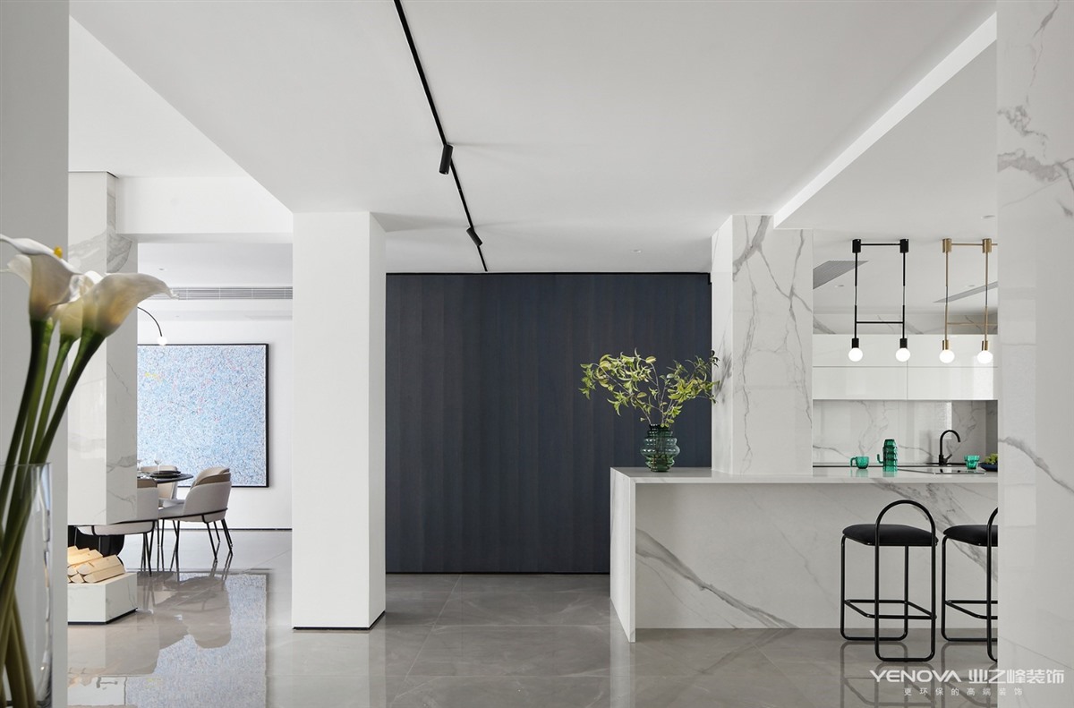 设计师说明:以理性思考的形式回归家居空间,展现舒适细致的人文关怀,规划灵动开放的布局与智能生活的理念。入户端景是室内室外的过渡,既能保证隐私也塑造了视觉的停顿和节奏感。客厅和餐厅的光线流穿在空间中,以丰富的层次奠定这个家平静温和的基调。