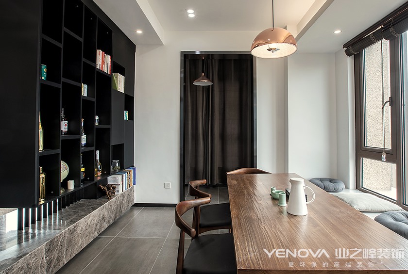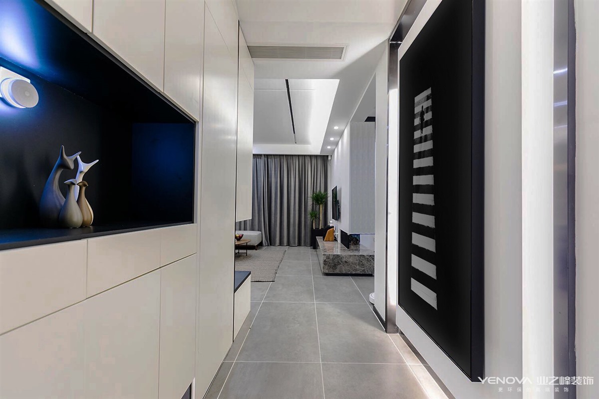 调整后的布局满足了屋主生活中所有需求。 客厅增加的一组贯穿X轴线的装饰柜即美观又具备收纳功能。 转角连接次位墙体的一组鞋柜及隐形门,使整个空间更加完整,大气。 餐厅借用原飘窗台铺设台面代替一组餐椅。
