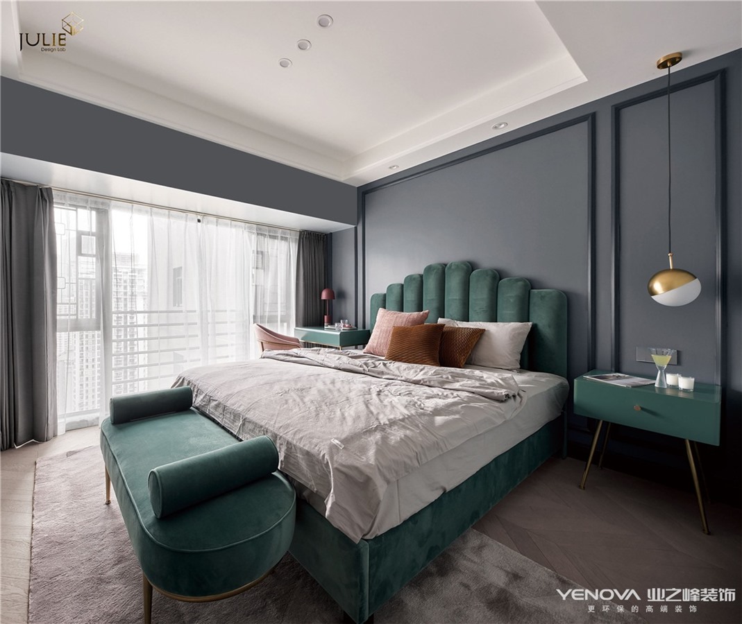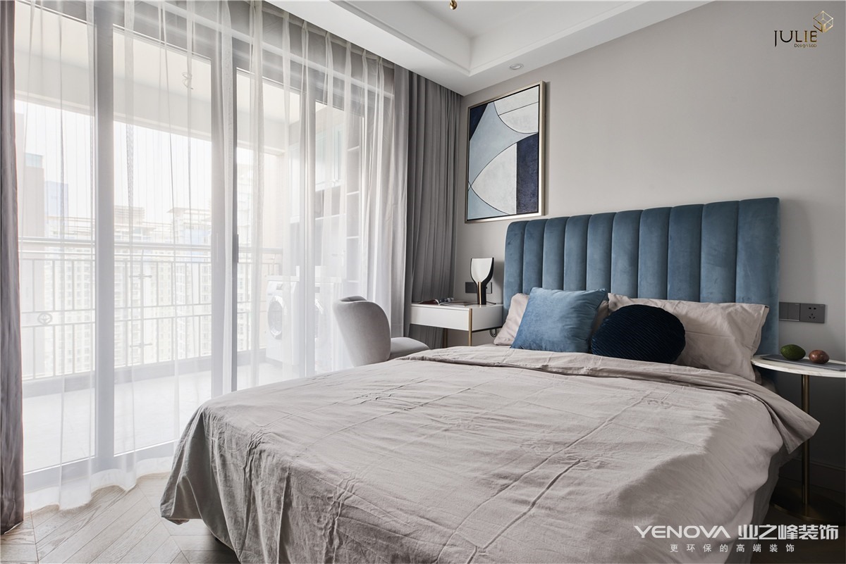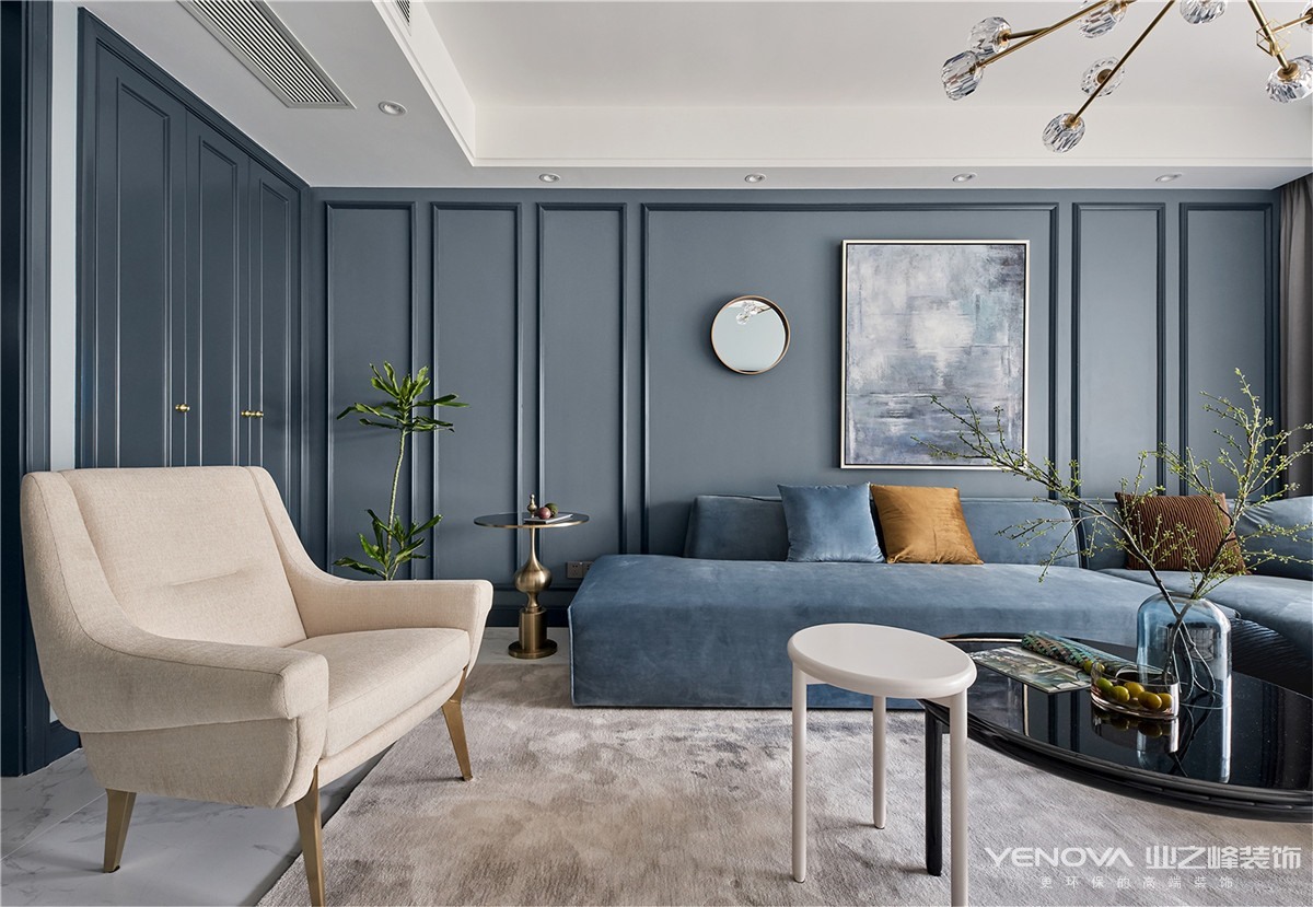 设计师说明:宽敞通透的客厅区域,用水墨蓝作为背景色系,让人沉静在轻松的氛围当中。雾霾蓝转角沙发,搭配米色单椅,清爽大气。精致的家具与陈设提升家里的品质感,舒服的色系搭配增添温馨感。