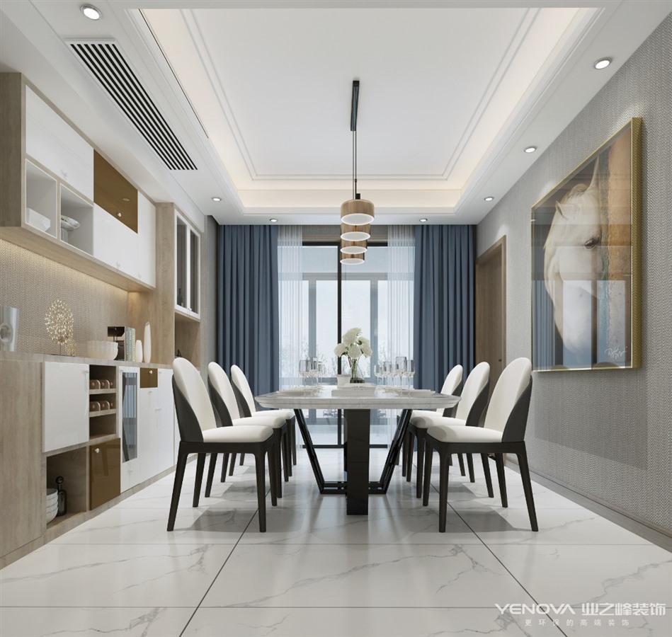 在风格上保持一致,两者之间通过大规格的石材纹理地面让空间相通,视觉延伸感更强。整个墙面采用高级灰墙布且作为主色调,搭配低调的莫兰迪色系窗帘,加上简洁耐看的空间设计感,带来更加直观的视觉感受。客厅整体呈现时尚大气的空间感,彰显个性的现代装饰画,白色皮质
