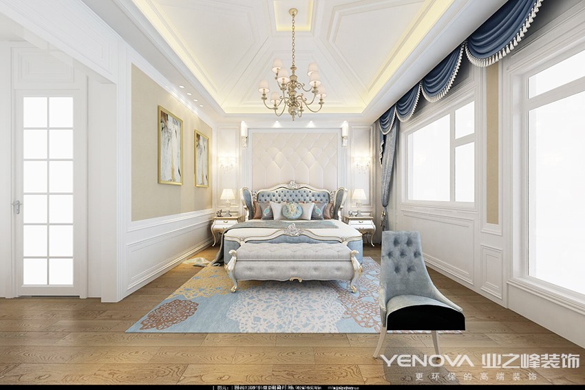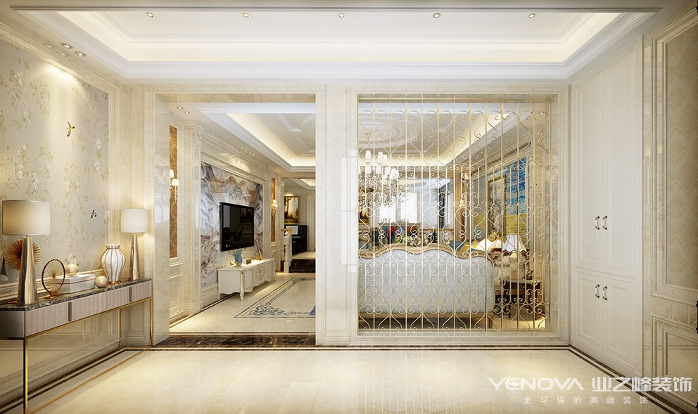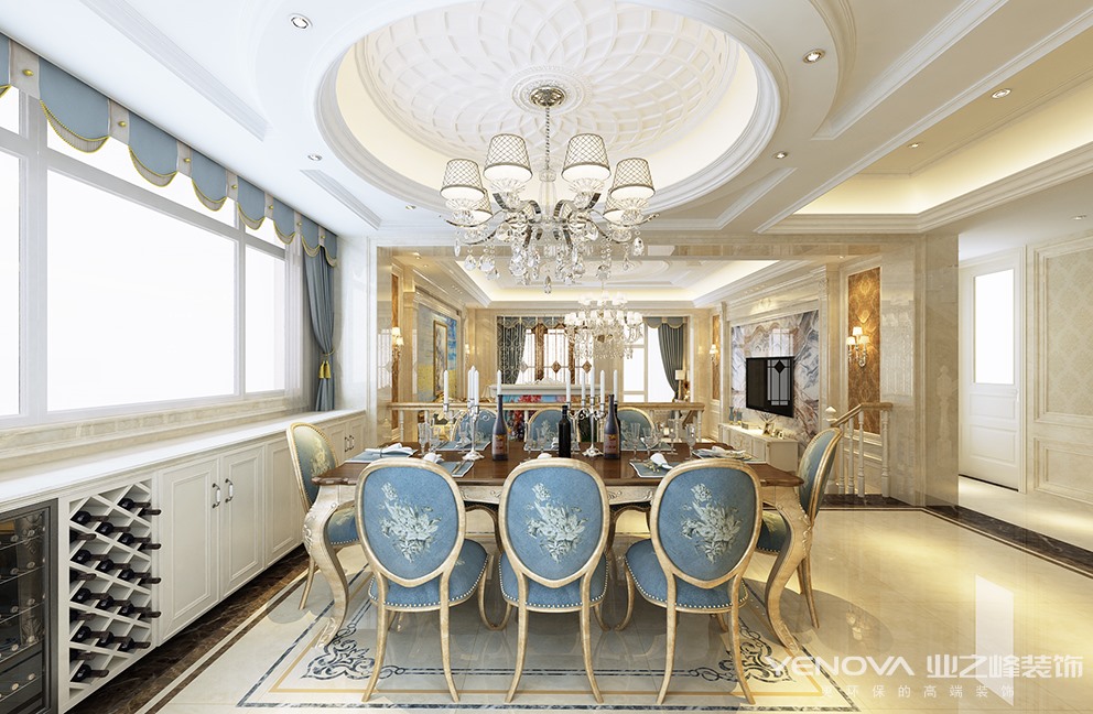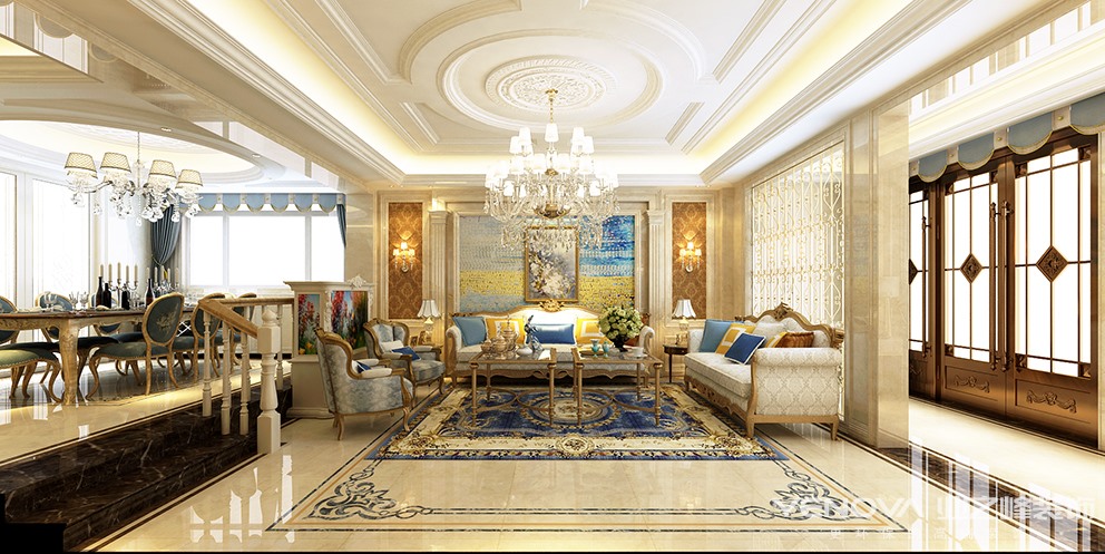 整个空间的家居都是设计师根据居者的生活方式与细节定制而成的,细节的统一更有整体感。达到软装全面定制与硬装饰无缝对接。欧式奢华风,高贵典雅,白色的淡雅搭配布艺的纯美;整体大理石墙板的装饰,在追求浪漫的同时,不失品质;布局上突出轴线的对称,气势恢宏,同时体现舒适的居住空间;在设计细节上,讲求及追求的则是心灵的自然回归感。