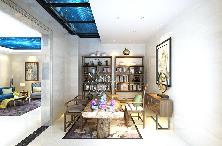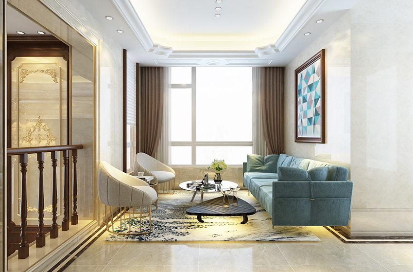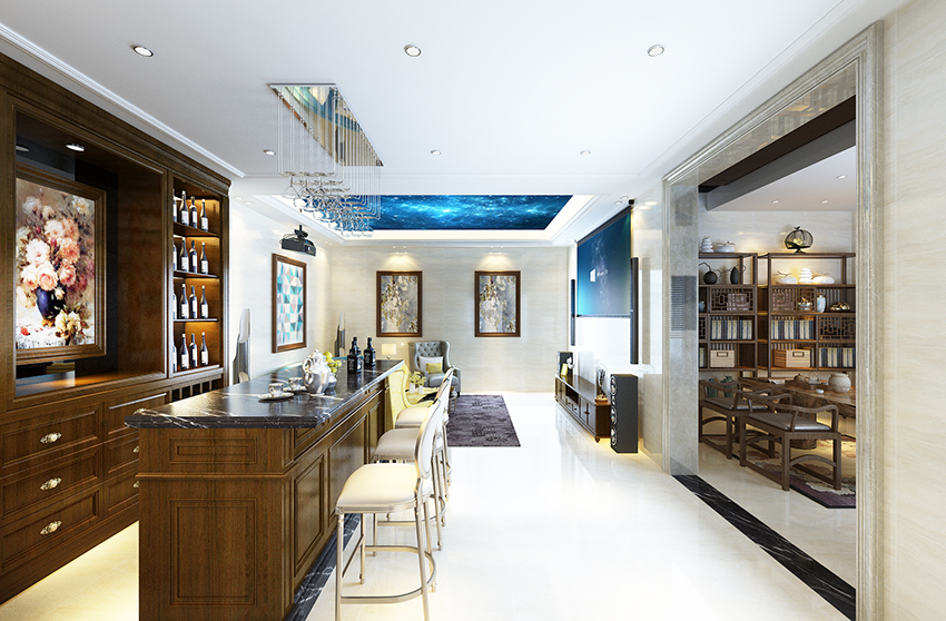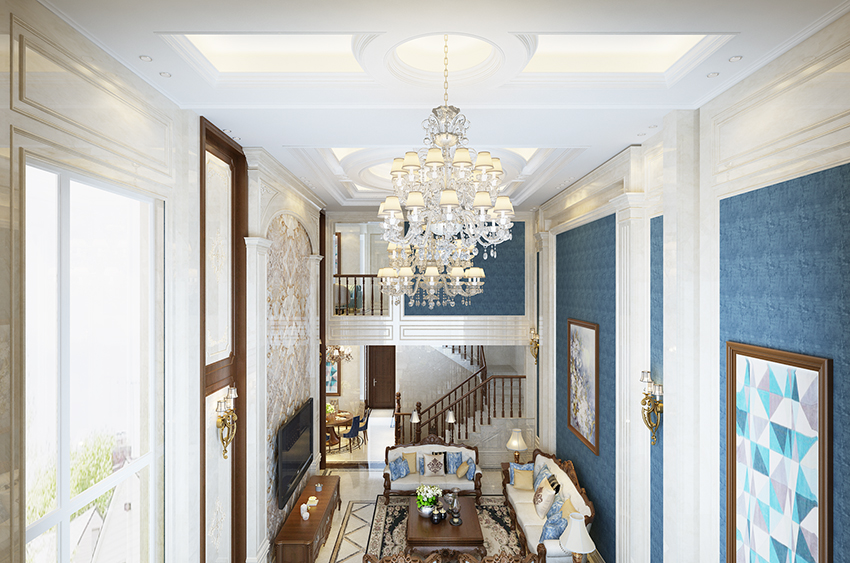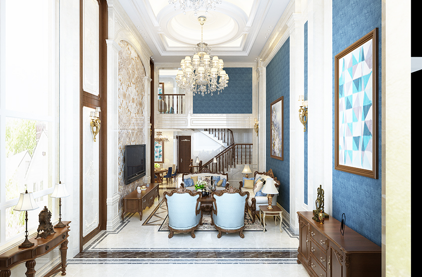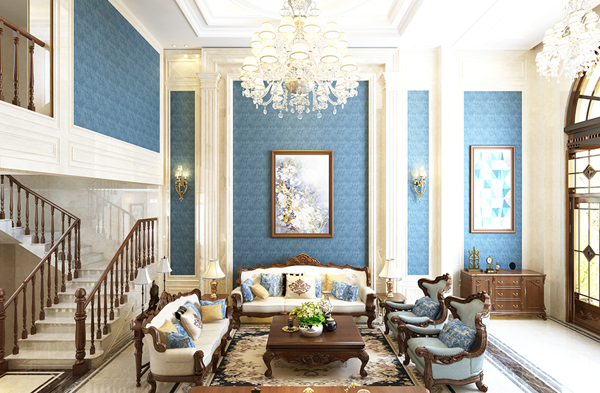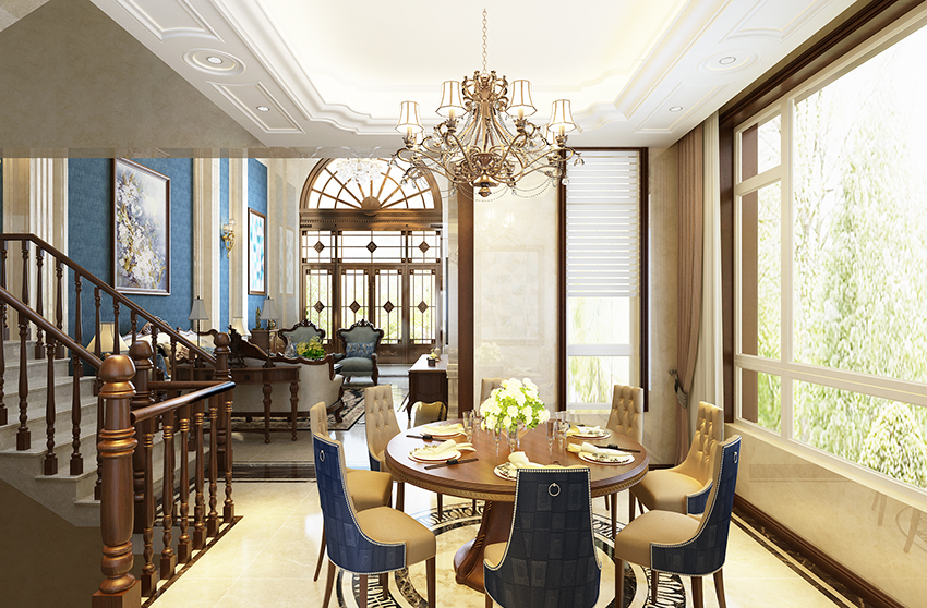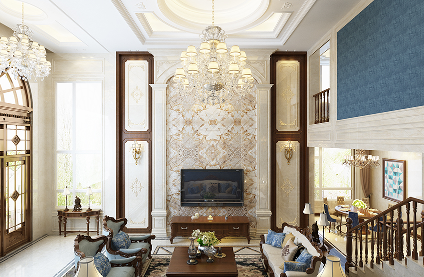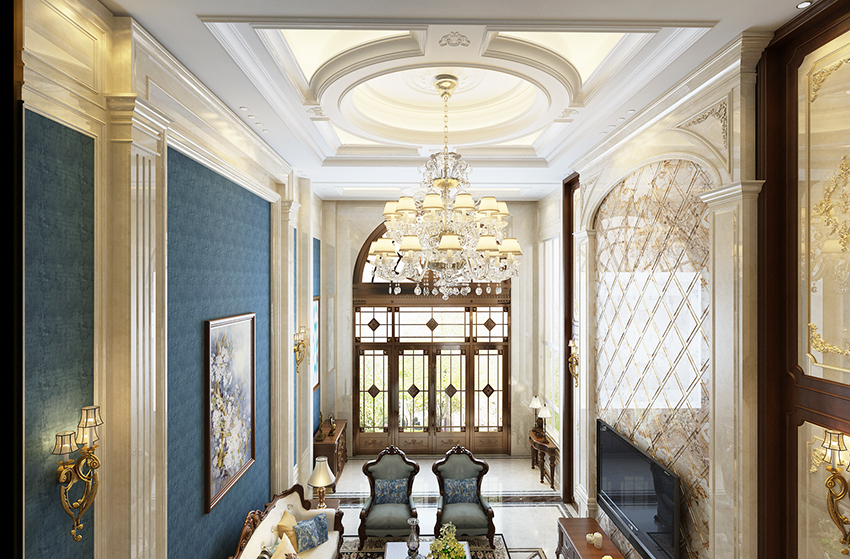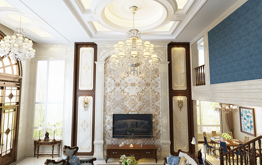 整个空间的布局强调轴线的对称,气势恢宏与豪华舒适相得益彰。空间呈现出高贵典雅的居家氛围。细节处理上采用雕花﹑线条﹑木制作的拼接,其工艺精细考究。