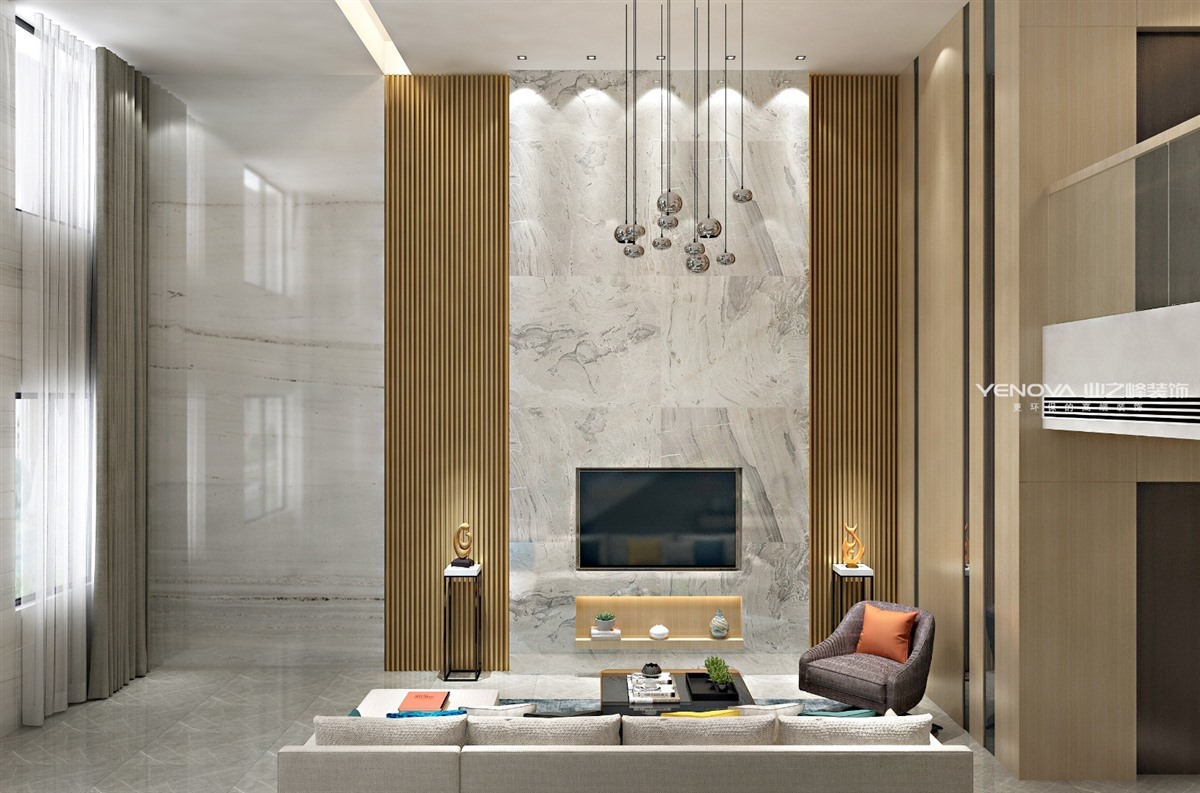本案设计风格为现代轻奢风格,居室整体采用浅色调,有令人眼前一亮的感觉。最重要的是强调功能性设计,线条简约流畅,色彩柔和。客餐厅地面浅色地砖,墙面搭配白色理石墙板造型,再用金属元素加以点缀,多用线条感照明烘托层次,最后再将软装融入设计风格之中,给人带来现代、时尚、大气的感觉。