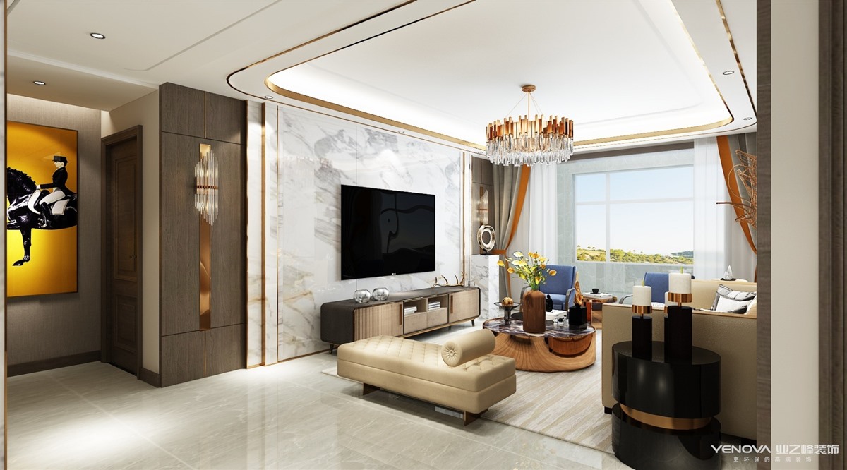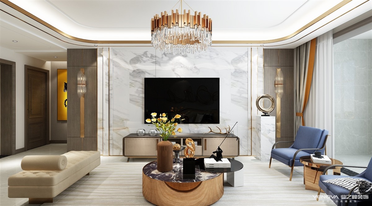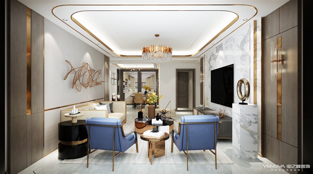 客厅在整体色彩的搭配上以米咖色为基调,缀以明亮的黄色和娴静的蓝色以增添色彩层次,活跃气氛。在材质的选择上,偏爱金属及水晶的搭配,使整个空间在利落简约中又增添了时尚浪漫的气息。