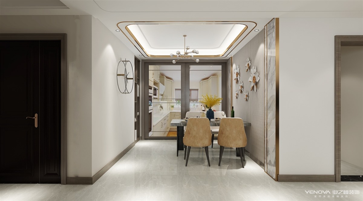 方正的布局将客厅与餐厅关联在一个整体的空间里,所以在餐厅的软装搭配上得以延续客厅的整体氛围。