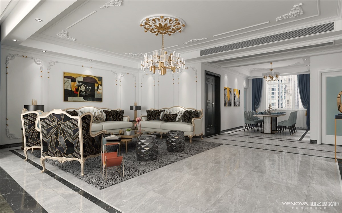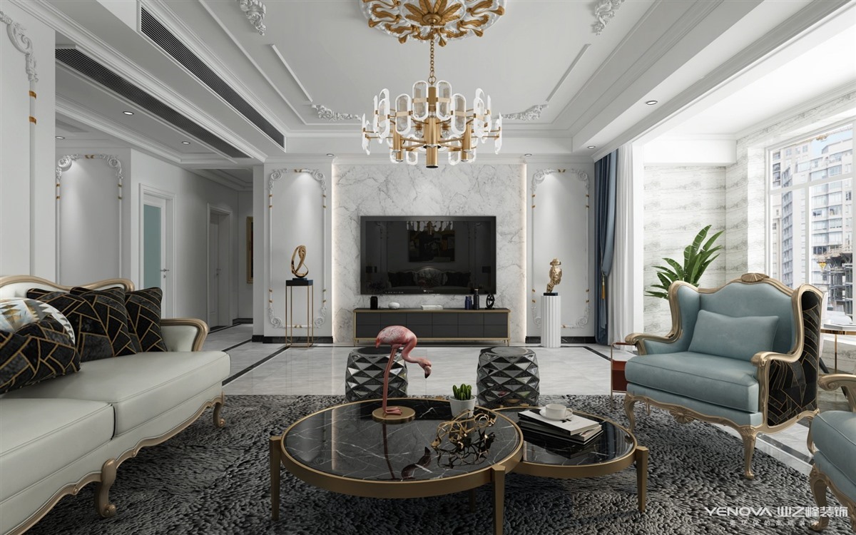 客厅整体以白色调为主,融入大量的轻奢风色调。电视墙用的是灰色调大理石,两侧镶嵌欧式浮雕,配以金色点缀。