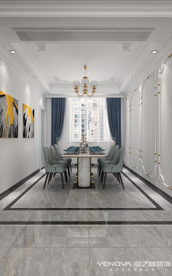 充满轻奢欧式元素的餐厅布置,营造出优雅的就餐氛围,淡蓝色桌椅与金色桌脚的碰撞,赋予了整个环境的高级质感。