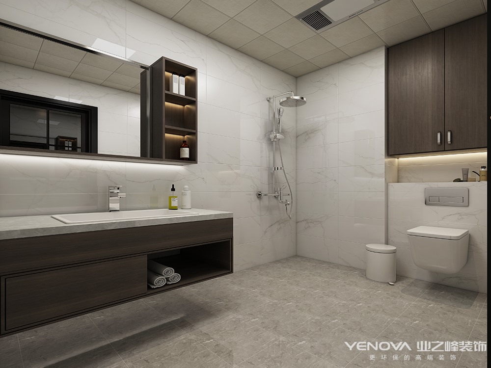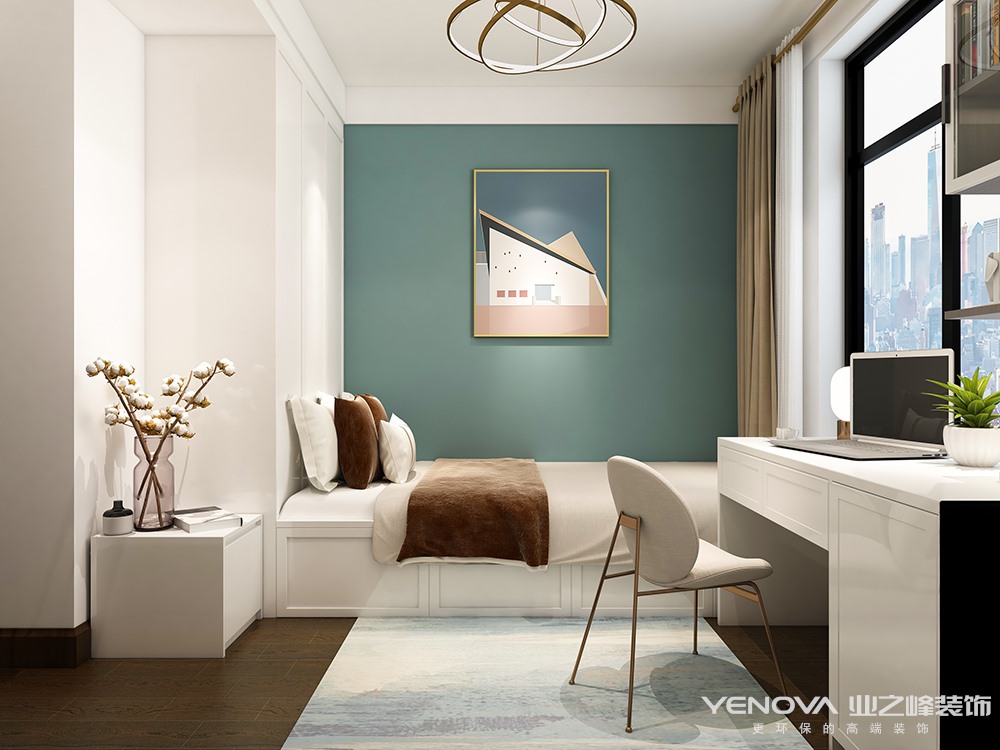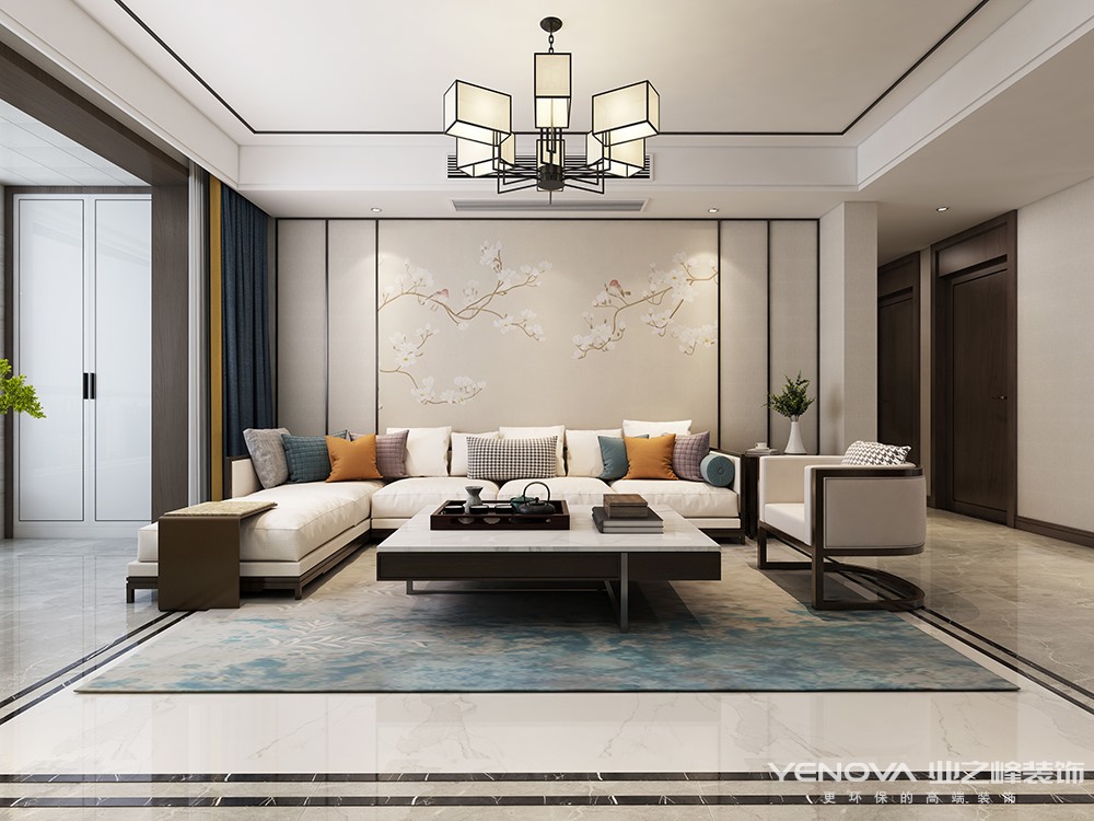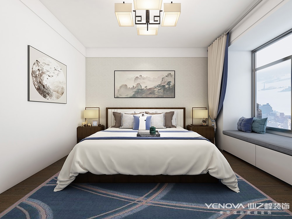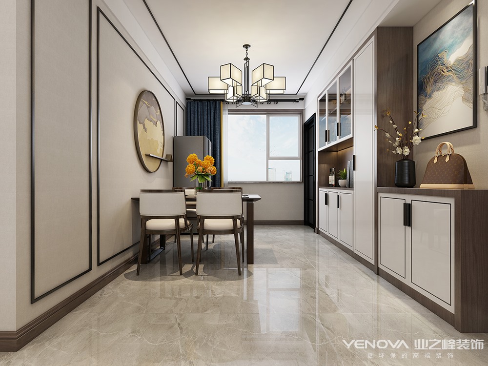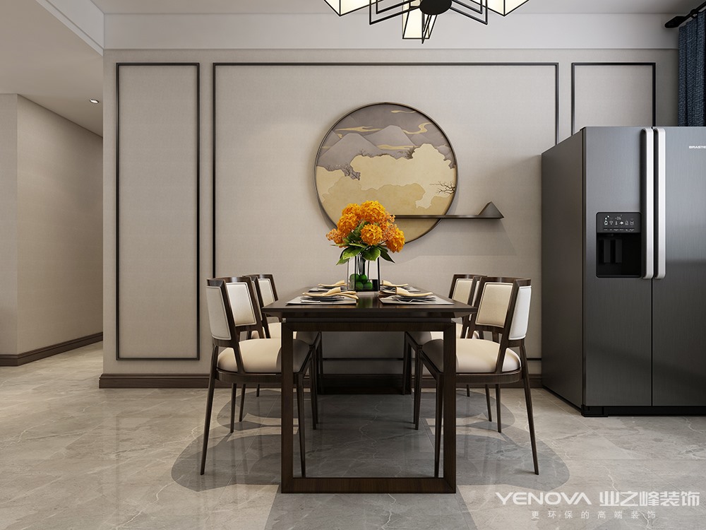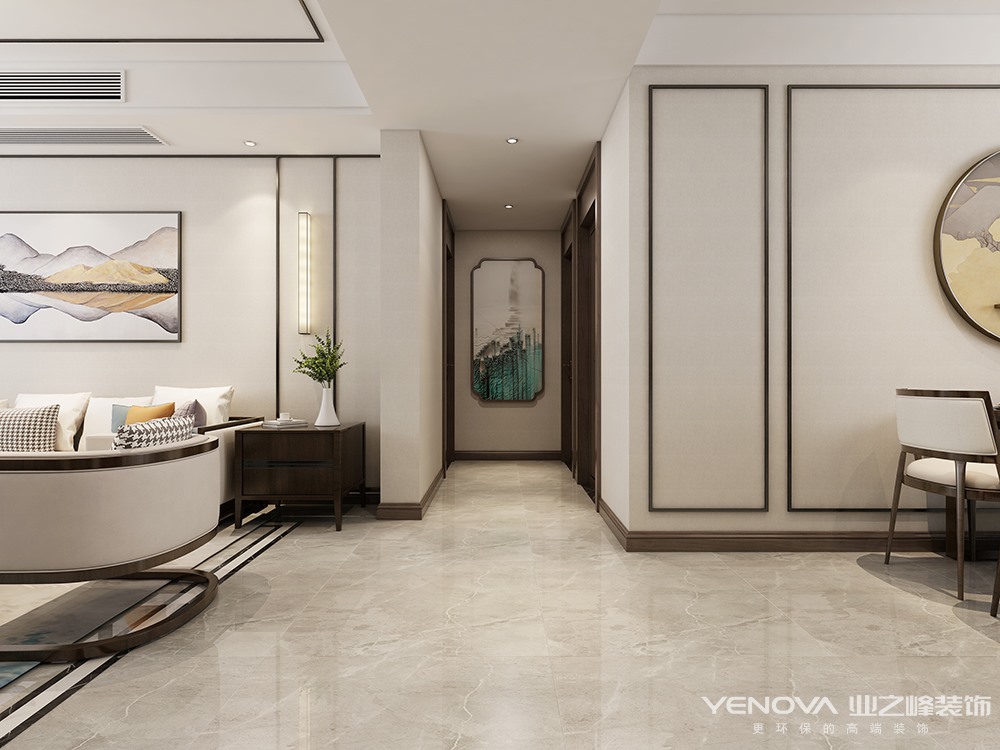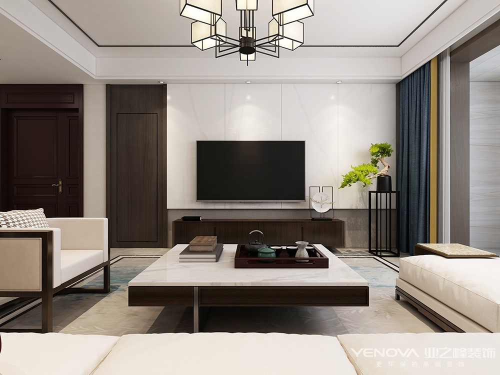 该方案通过极简的木制线条、中式元素的饰品与现代元素相结合,达到了既不过于庄重古朴,也不气氛沉闷的效果,还给人以实用、时尚的感觉。电视墙瓷砖、隐形门搭配出时尚感,加之中式元素的饰品搭配出庄重感。沙发墙简约木制线条与极具诗意的壁画相结合展现出主人高洁的品质。整体搭配简约不失品质,诗意却不沉闷。