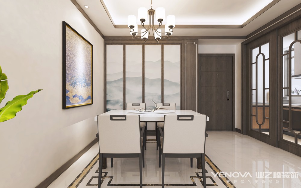 餐厅空间在青山、碧湖、翠鸟的自然意象上延伸,在材质、形制、色泽等的细部上依稀可感雅澹而隽秀的格调,平静湖面的一圈圈涟漪交织定格在艺术画框里,倒映在格纹与镜子的组合装置中,一切落得雅韵清浅,而况味深长。