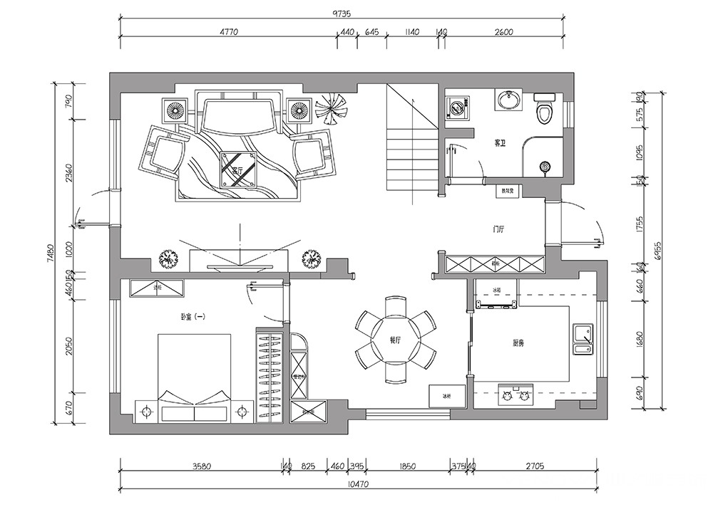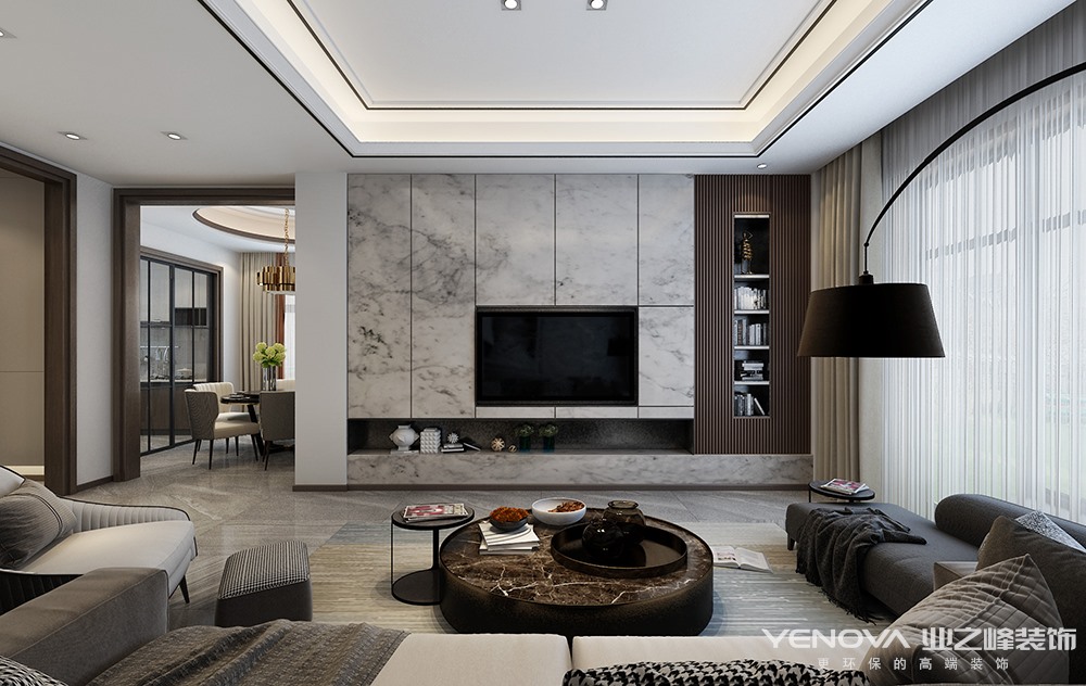 客厅电视背景墙采用石材上墙,提亮整体空间亮度,与原木色墙板相呼应,将时尚与温馨相结合,客厅沙发采用布艺沙发,提升整体时尚感,墙面挂一幅黑白相间的艺术作品,将时尚与艺术体现的淋漓尽致。