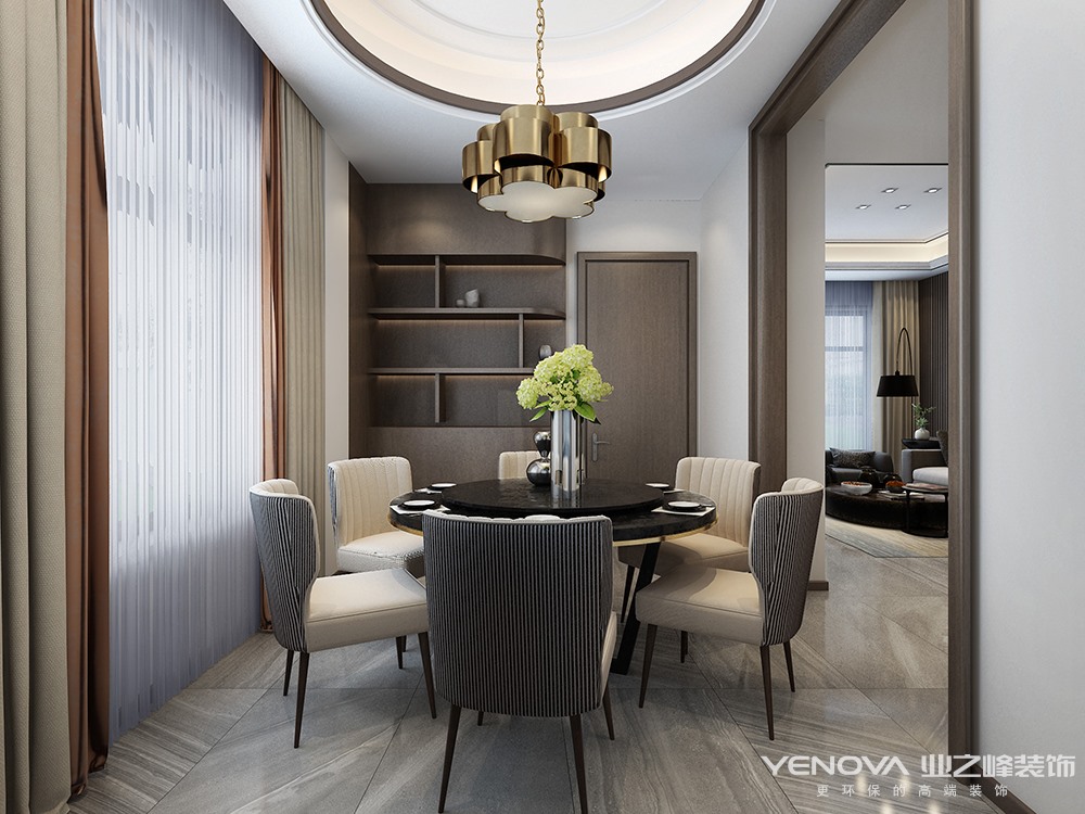 餐厅墙面采用客厅相同颜色墙板做柜子使用,与客厅相呼应,视觉上延伸了空间的整体感,餐边柜采用条纹椅子与金属灯的结合,将简约的风格立马提升了一个档次。