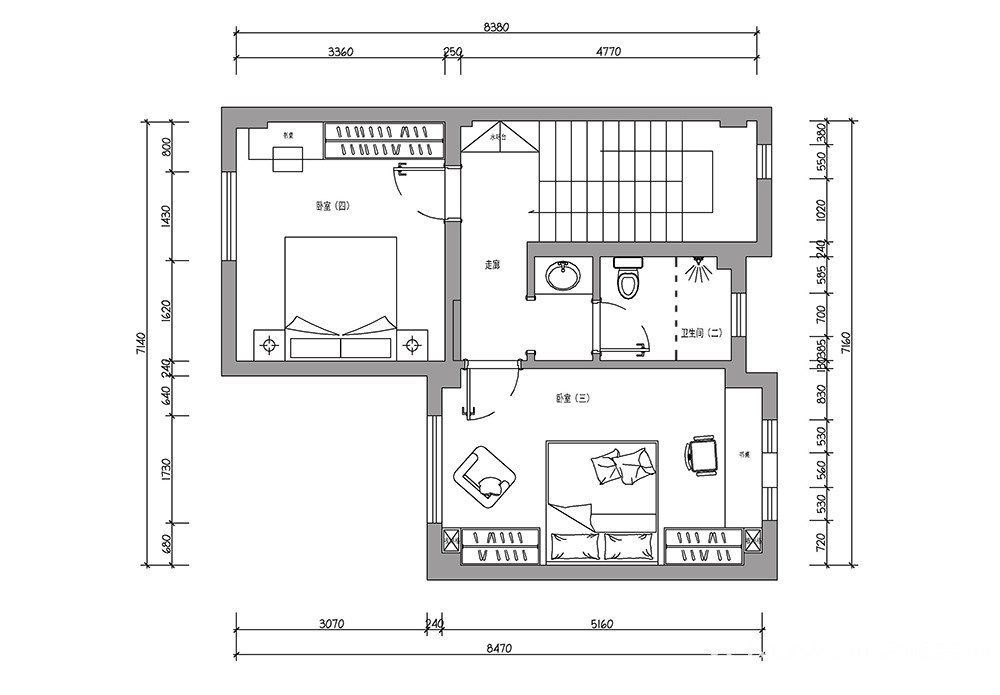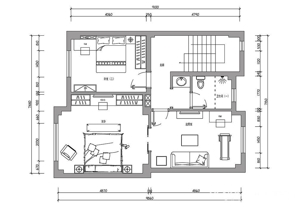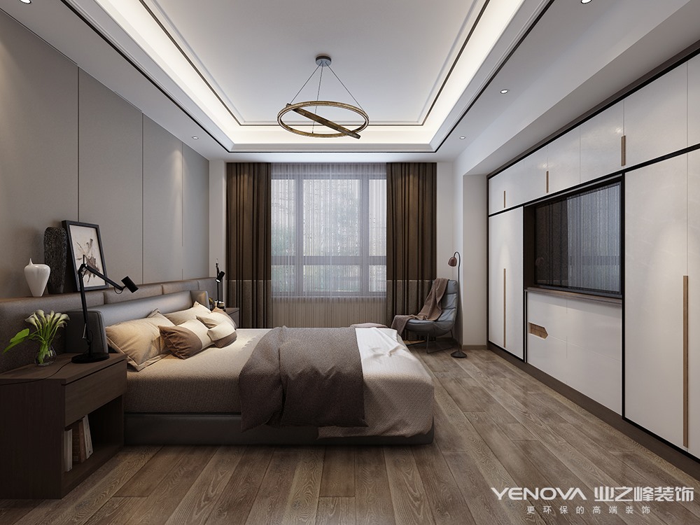 主卧墙面采用硬包与软包相结合,使得卧室温馨感十足。床整体是皮质感,与木质床头柜形成一定材质对比,但整体颜色协调统一,再搭配白色的柜体板,点缀整个空间。