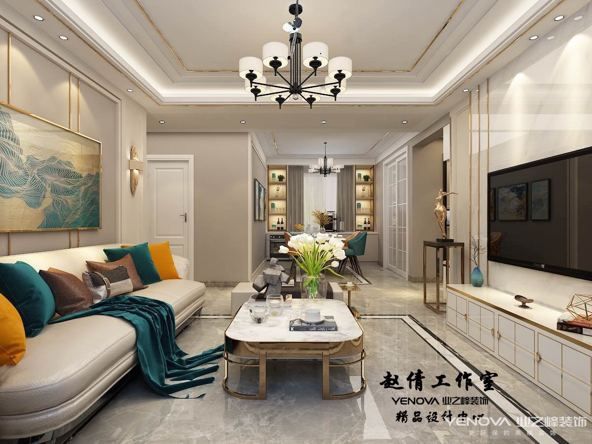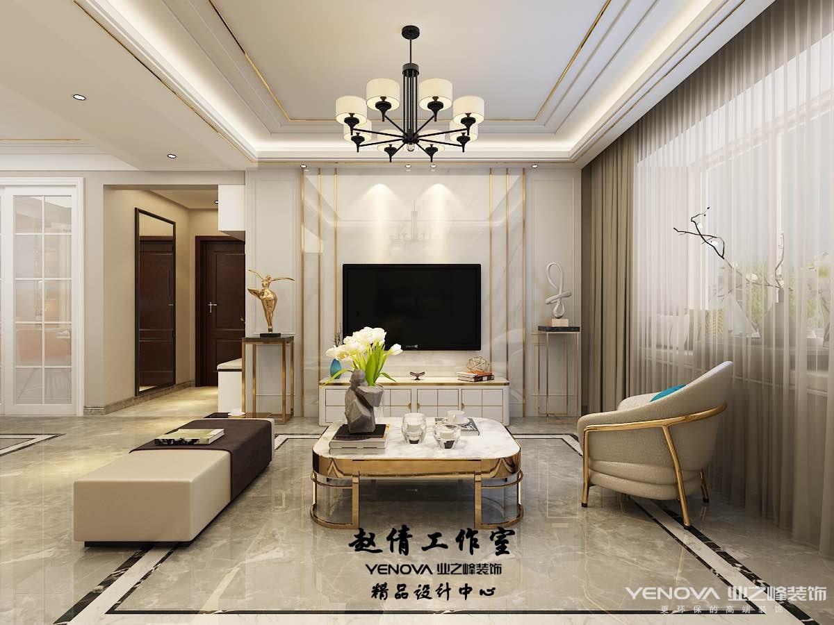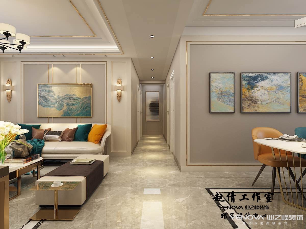 以纯度偏低的暖色色作为大面积白的辅助色,融入优雅皓白,低调奢华的金属色调。在功能方面,客厅是主人品味的象征,体现了主人品格,地位,也是交友娱乐的场合,电视背景墙采用石材、护墙板做了简单的造型处理,既简单又大方,又不失去奢华,沙发背景墙做了硬包,地砖采用灰色系,配置一些装饰品非常的简洁奢华。