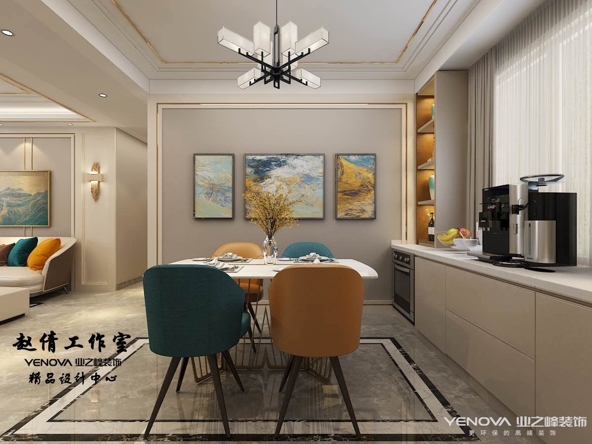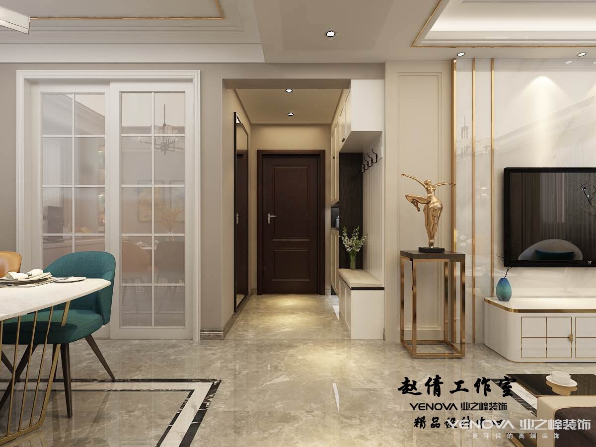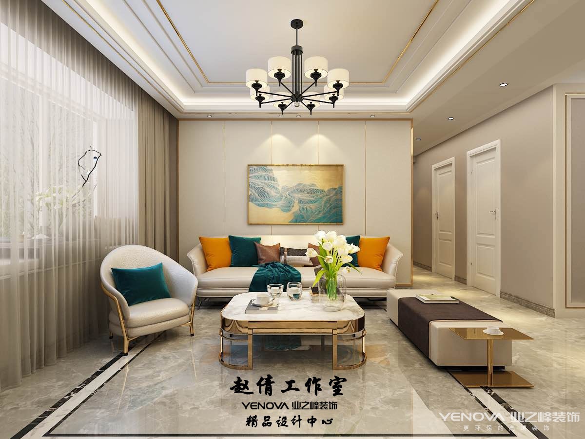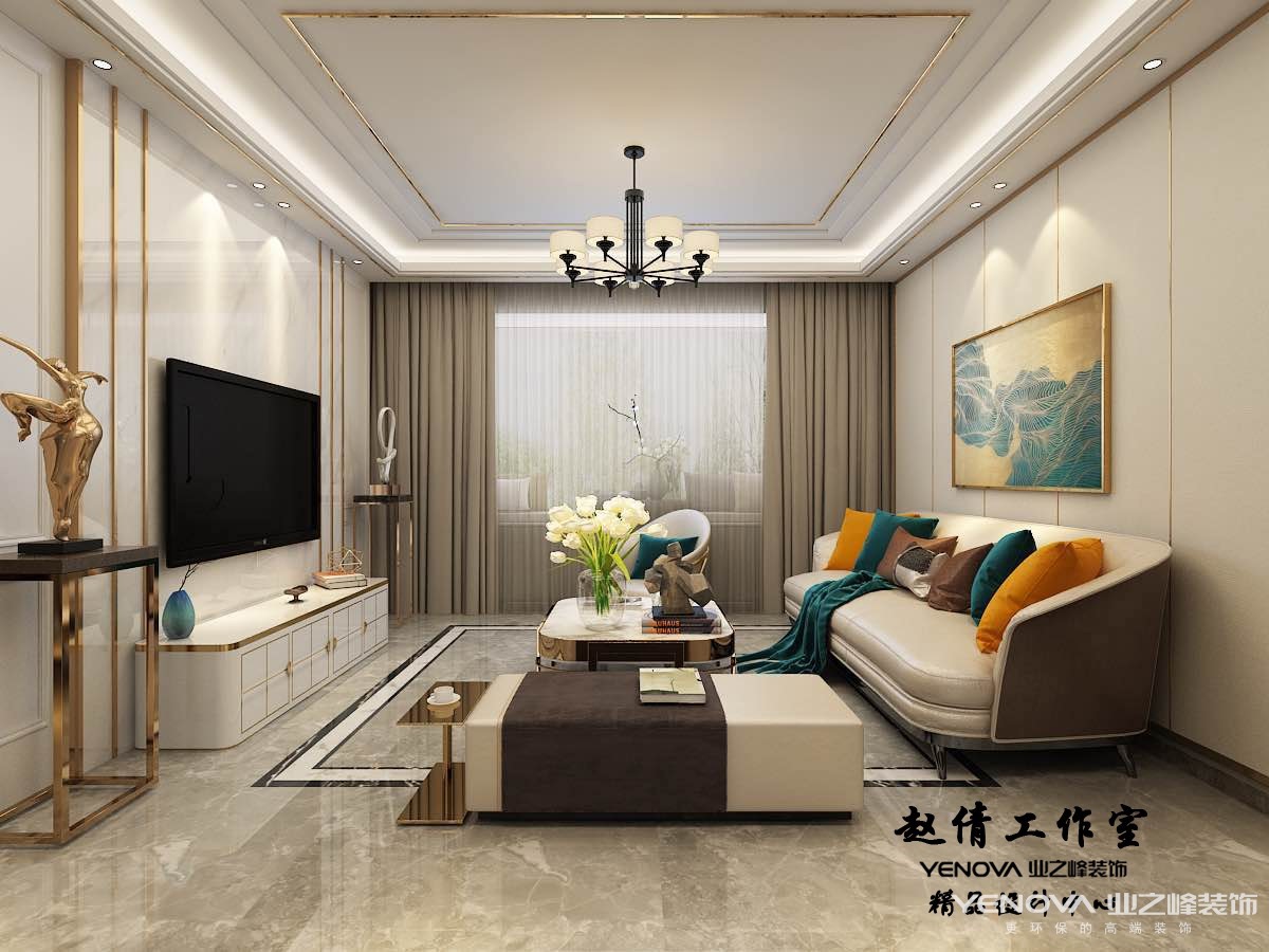 以纯度偏低的暖色色作为大面积白的辅助色,融入优雅皓白,低调奢华的金属色调。在功能方面,客厅是主人品味的象征,体现了主人品格,地位,也是交友娱乐的场合,电视背景墙采用石材、护墙板做了简单的造型处理,既简单又大方,又不失去奢华,沙发背景墙做了硬包,地砖采用灰色系,配置一些装饰品非常的简洁奢华。