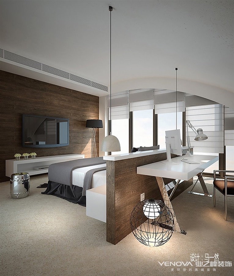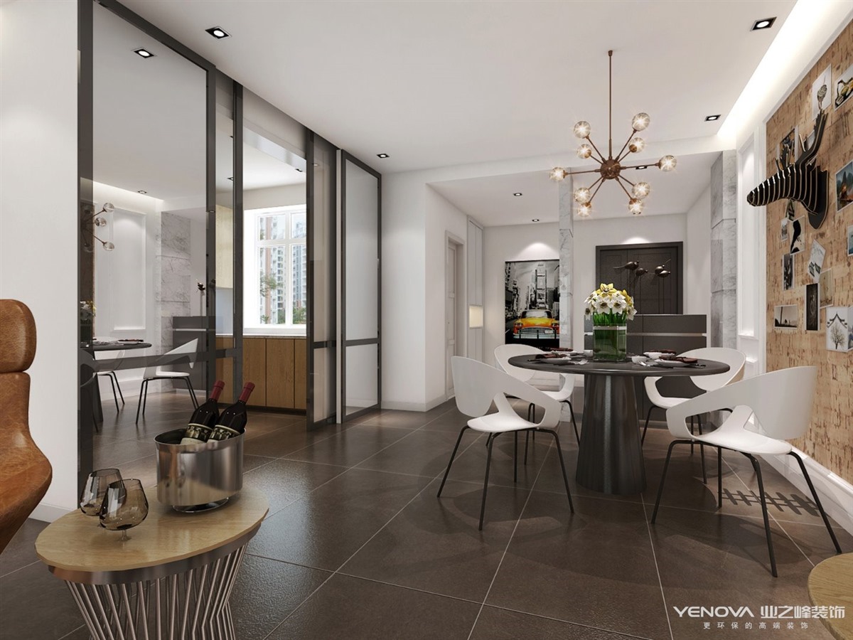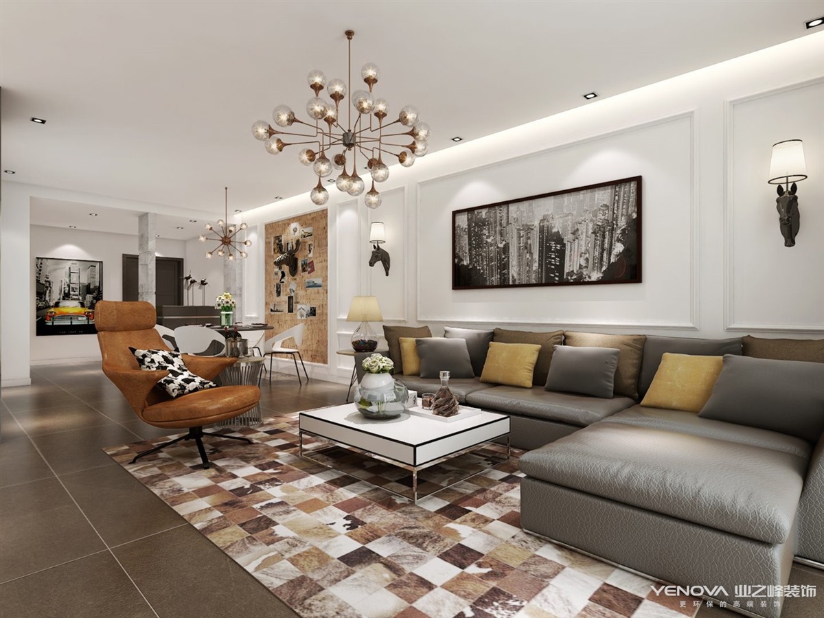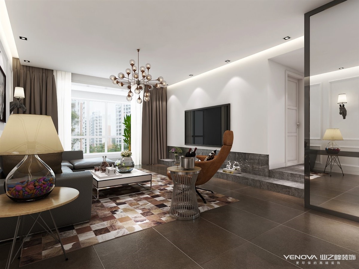在家居设计中,巧妙的运用高级灰+棕色,实力演绎高端质感,暗藏于平静之下的优雅格调,沙发背景墙简单做几条石膏线条,搭配重色的壁灯及装饰画,适度黑色让空间更沉稳。电视背景墙摒弃了常规的电视柜摆放,做一个石台延申至过道空间,使之成为一个整体,增添艺术气息。客餐厅摈弃了常规的垭口设计,使公共空间统一协调又各具特色的矗立在整体色调氛围中,形成于餐厅的视觉互动,独立成景,又移步易景,充满生活趣味性。