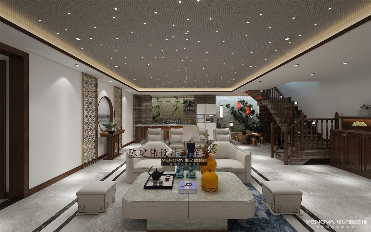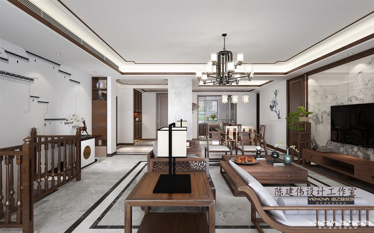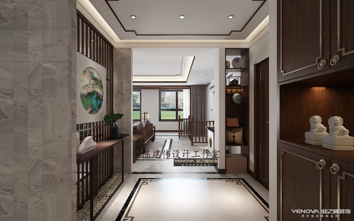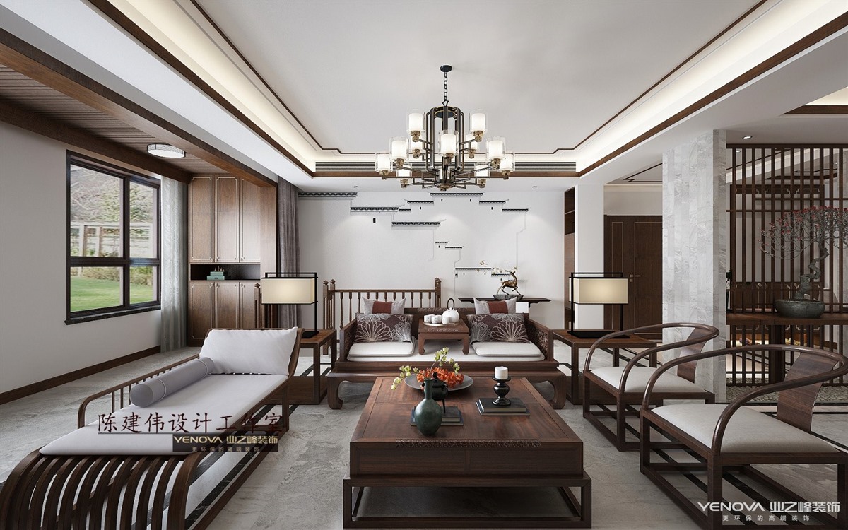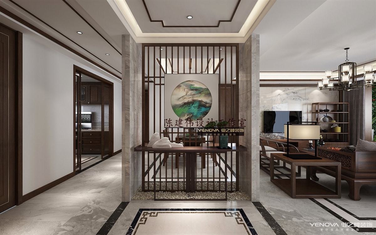 本案将传统中式以红、黑为主的风格与当代社会的时尚元素敏感有效的结合在一起。保留中式传统的室内陈设,字画,盆景,屏风,博古架等。同时在细节上崇尚自然情趣。使得房间更加丰富。大而不空,厚而不重。客厅的大空间摆上实木家具和阳台的生态木引起共鸣。线条的玄关造型和两个独立单人沙发给人以轻松明快的视觉效果。顶面的木质线条勾勒出吊顶的形状并加以丰富。简洁的造型墙利用古代的瓦砖屋顶奠定了传统中式的古风古韵。