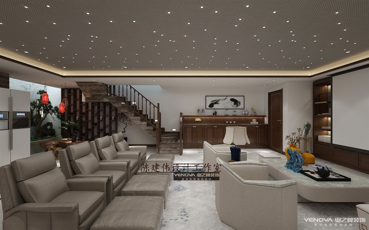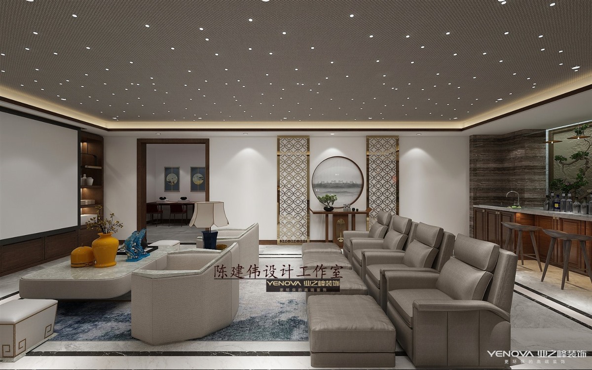 地下超大空间用为影音室,一家人晚上一起看一部电影,还备有水吧台和景观区,大大提高了居住环境的舒适度。这正是我做设计师这份职业的初衷,用我们的专业知识和审美要求为客户创造更加舒适的居住环境。同时通过丰富的细节诉说房主自身的阅历和心境。