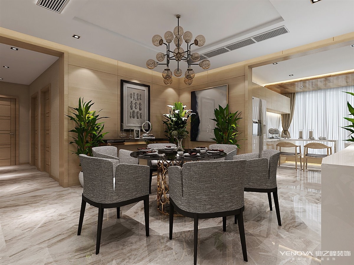 本案在满足功能的基础上做到最大程度的简洁,设计装修不再一味追求加法,强调室内空间宽敞,内外通透,在做减法的程度上满足客户基本的生活要求。餐厅是由米色系和灰色系打造的——最简单的,也是最高级的。餐桌旁的定做柜子可以放置主人珍藏红酒与生活用品。