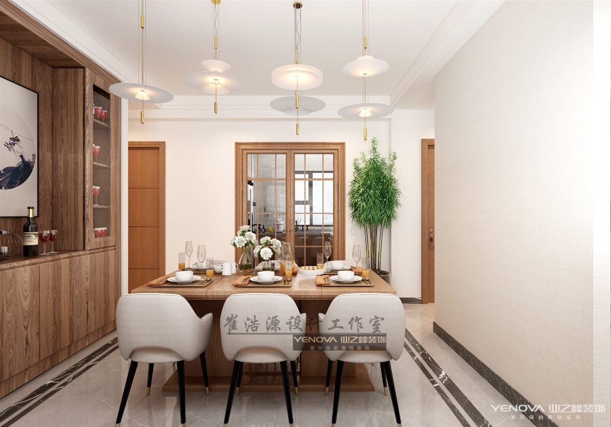 新中式风格是通过对传统文化的认识,将现代元素和传统元素结合在一起,以现代人的审美需求来打造富有传统韵味的事物, 让传统艺术在当今社会的到合适的体现,整体的设计元素都已原木色搭配,木门、家具细节色彩的统一化,清新淡雅。