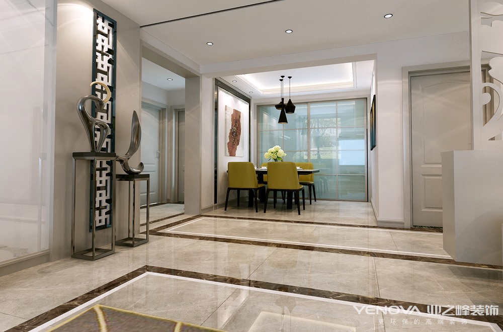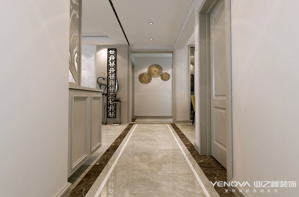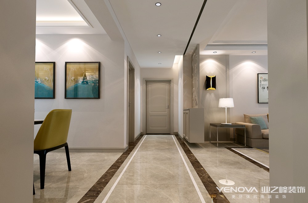 本方案整体色调以灰白色为主,主材分别用到了灰色大理石地砖,法国灰木门和木作造型,墙面使用