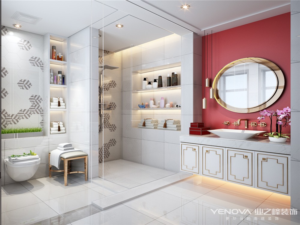 入户门厅将中式风格纹饰的元素体现的淋漓尽致。客厅不规则的茶台简洁线条的家具,面对着正面的落地窗户,及富有偷得浮生半日闲的意味。老人房减少多余的家居摆件,营造一个纯粹的睡眠休息空间。主卧室则相反,强调了身份感,用恰到好处的颜色搭配塑造了一个有着高品质要求的精致空间。厨卫的的设计将现代简洁和新潮中式相融合落落大方。