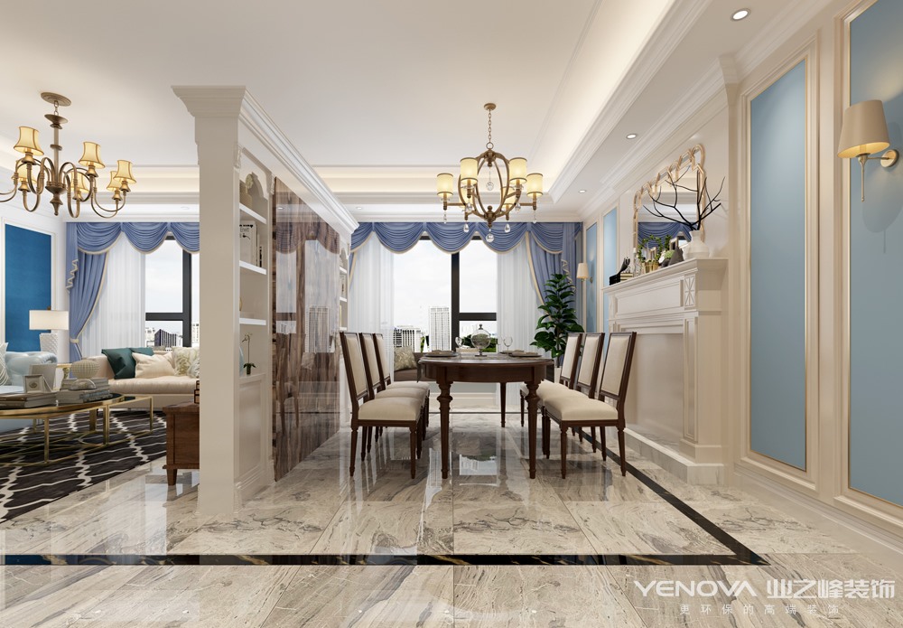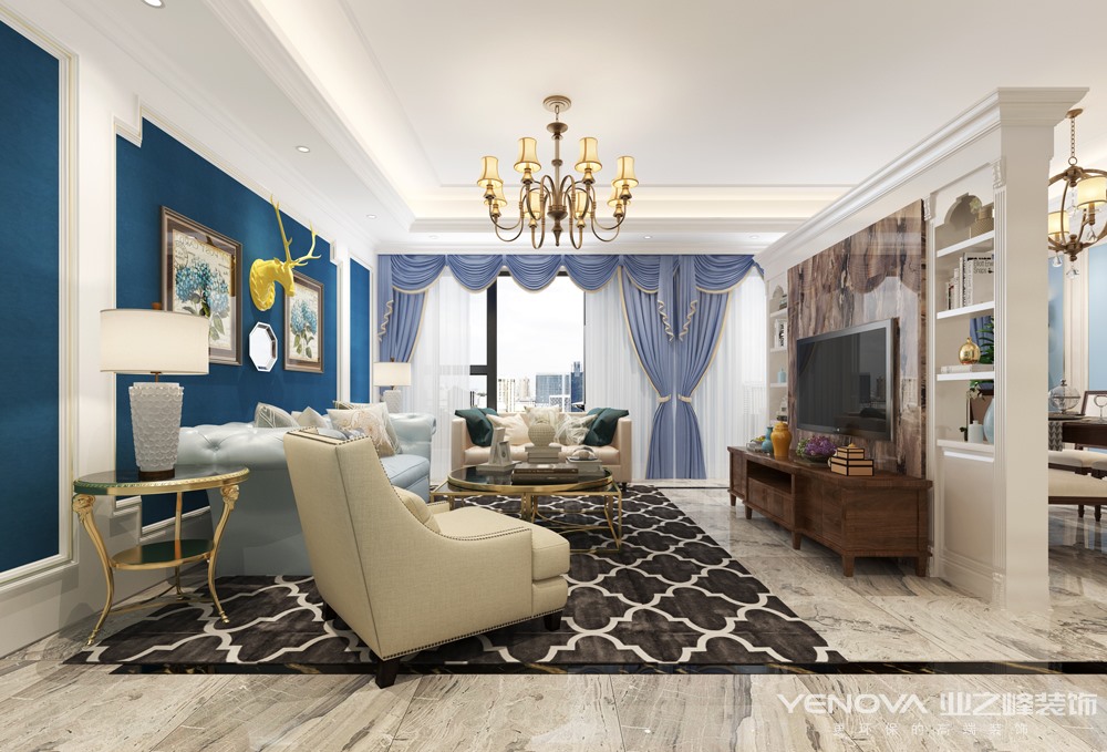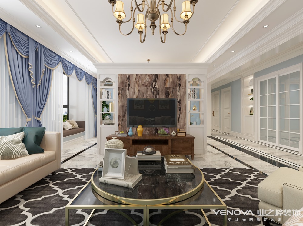 一、客厅:美式客厅风格较多采用嵌入式石膏吊顶,再搭配精致的水晶吊顶,从而营造出一种怀旧、浪漫的感觉。大理石主要作为地面装饰材料,光泽感极佳。在沙发区也可以铺上大幅花纹地毯,这样会使空间区域划分更加清晰。另外,造型复古的组合沙发以及茶几都具有上乘的质感,让美式古典风格得以进一步的彰显。