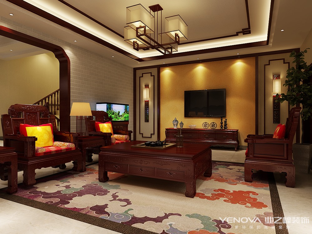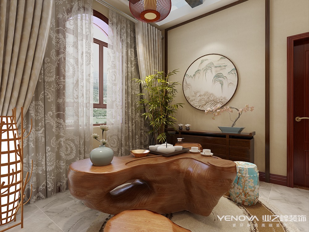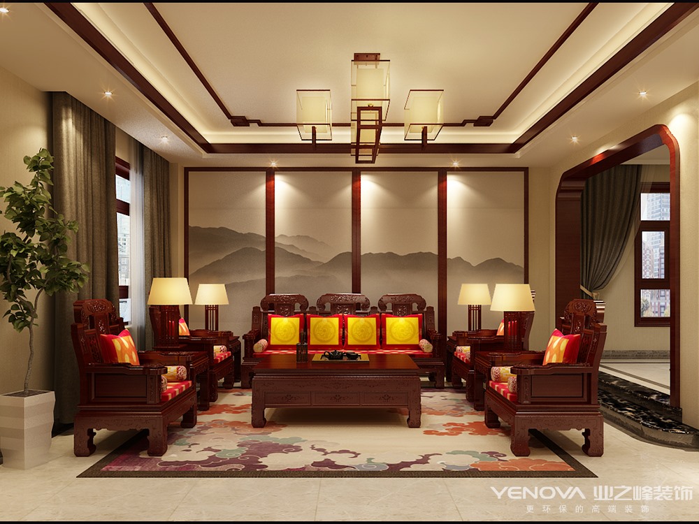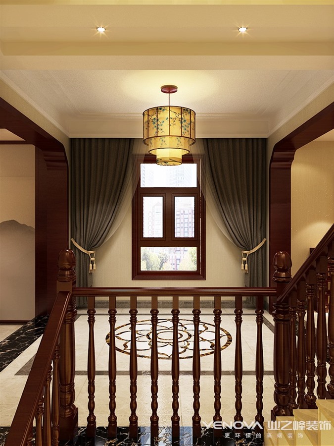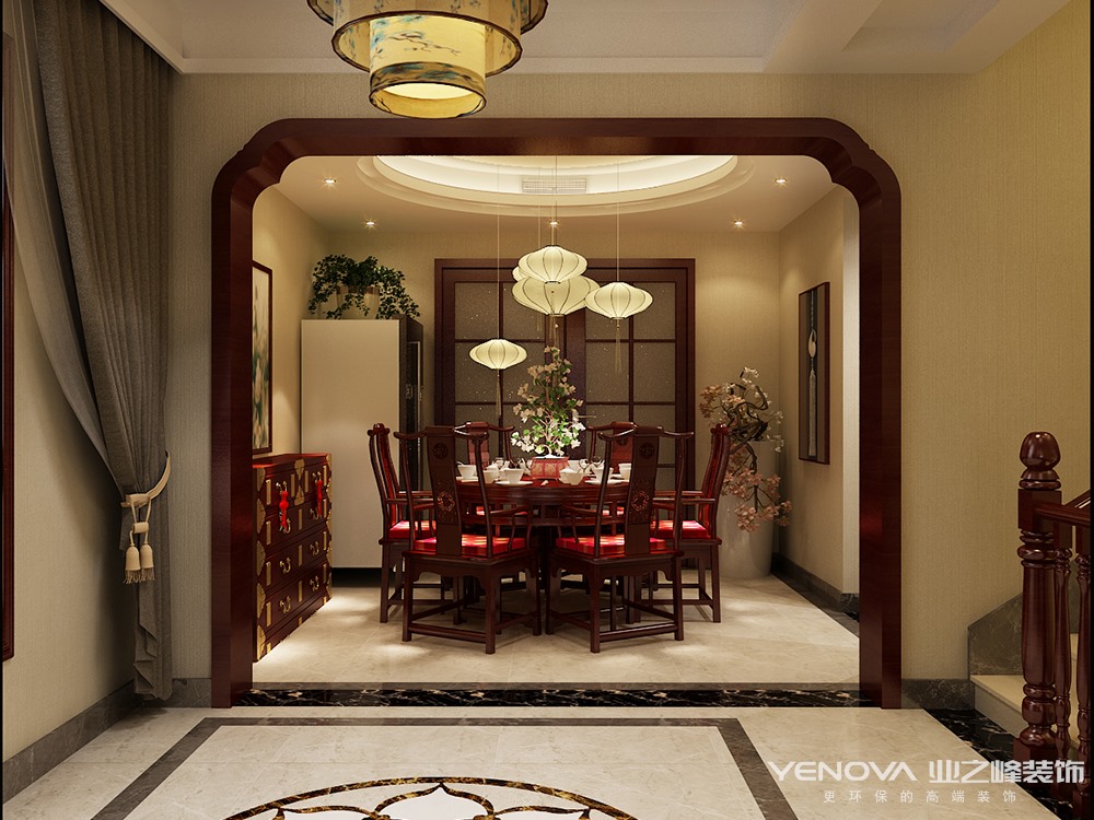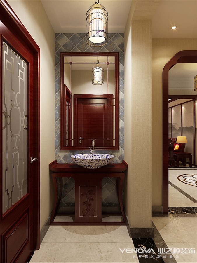 本案定义为新中式风格,采用质感极佳的轻金属勾勒线条,整体空间打出层次。玄关位置采用中国传统葫芦造型,寓意福禄双全,且设计中采用圆形穹顶配合地面百凤云集拼花图案,另隔墙采围合造型。寓意聚气聚财。