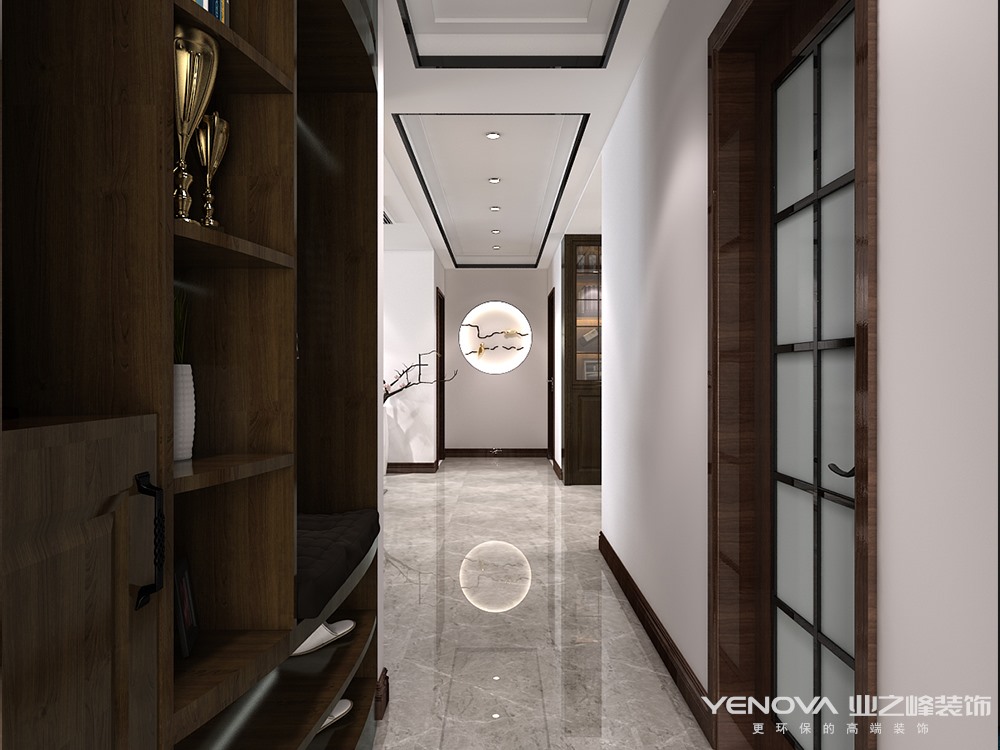 本案定义为新中式风格,采用质感极佳的轻金属勾勒线条,整体空间打出层次。玄关位置采用中国传统葫芦造型,寓意福禄双全,且设计中采用圆形穹顶配合地面百凤云集拼花图案,另隔墙采围合造型。寓意聚气聚财