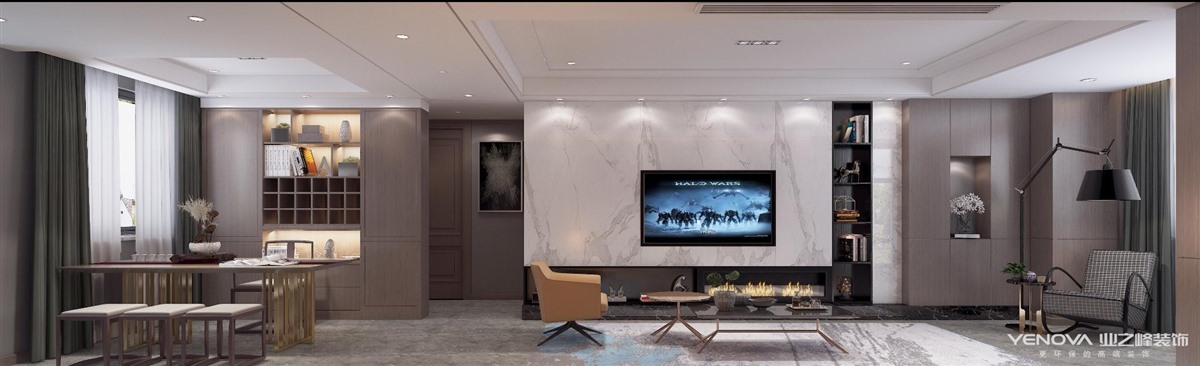 本案以现代简约作为设计的原点,空间色调采用高级浅灰为主调碰撞胡桃木纹色,局部点缀热情的爱马仕橙,恢弘气势,高贵典雅,用线条营造一个独具现代特色的浪漫空间。客厅采用爵士白为主基调,黑色的开放格作为背景面的区分,配合温暖的壁炉彰显出高贵典雅的贵族风格,电视背景墙和沙发背景墙采用不同材质、不同色系的非对称设计,既相互映衬又相互区别。精致落地灯弧形曲度显得优雅矜贵,在客厅灯光的搭配下,显得清新素雅。