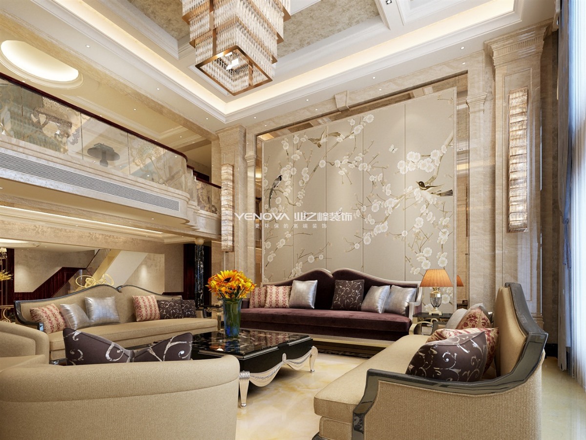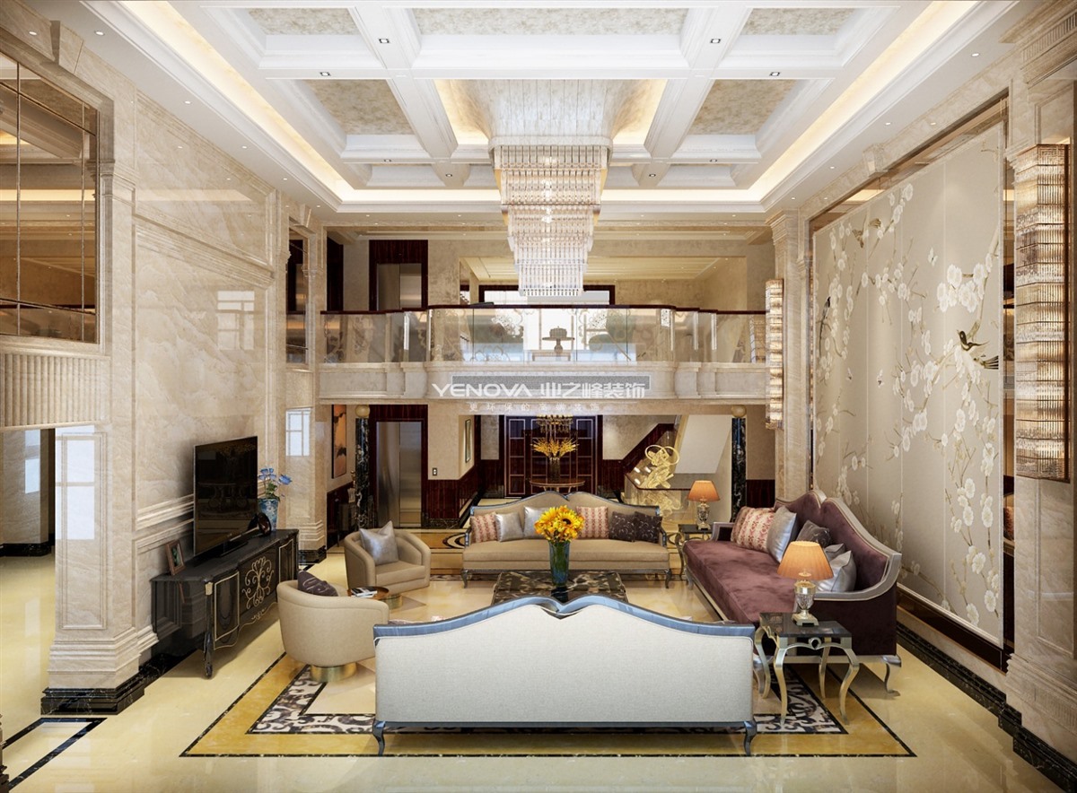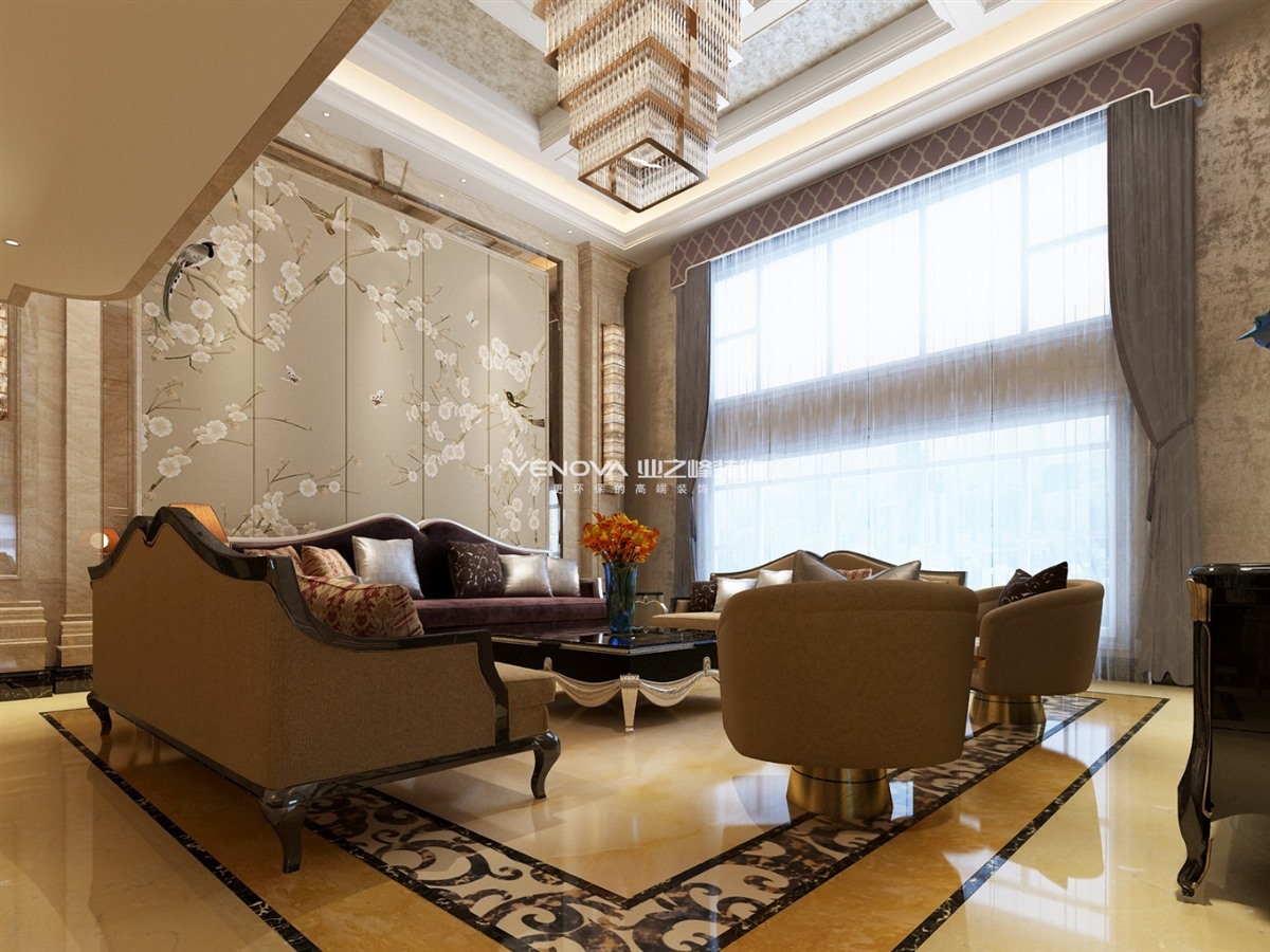 本案为1000平米别墅,风格定为新古典设计,在平面设计规划上着重追求空间的高挑和实用性。在满足功能齐备的前提下,做到空间的通透增加互动性。效果方面整体以石材为主,结合黑檀木质墙板加之墙面卡其色艺术涂料。配以跌级吊顶营造殿堂级视觉效果。