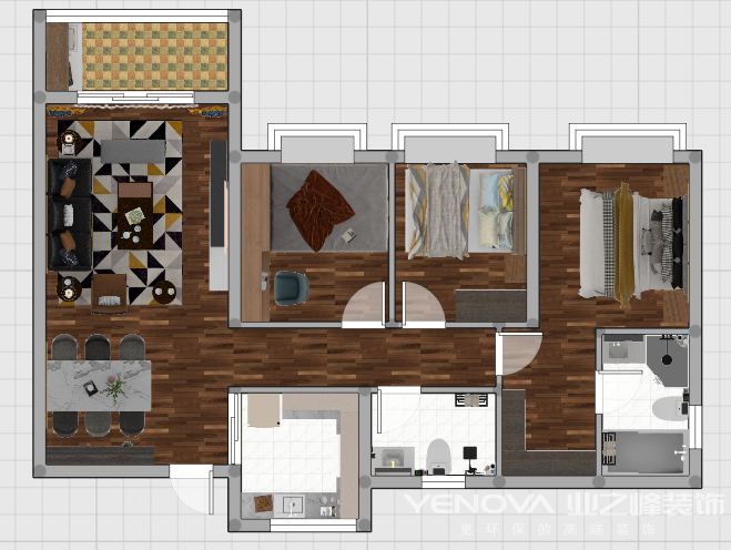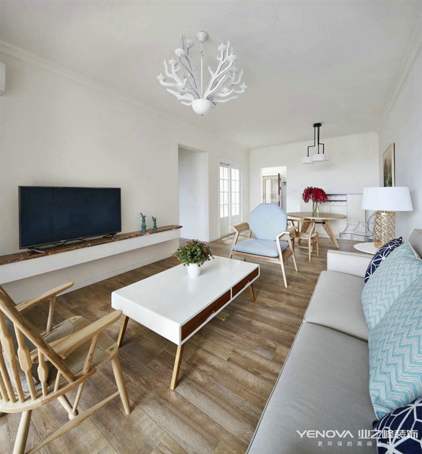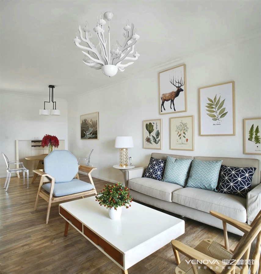 繁忙的社会里,年轻的夫妻二人,把对社会的信心与希望凝聚于家庭,房屋横梁简单修饰,保留原顶,白色乳胶漆饰面,符合男主人干练的性格,原木色的家具及挂失,代表了女主人不同常人的稳重,白色与素黄色的搭配,相辅相成,就像这对年轻夫妻的相处之道,在这个家里,他们也会走到最远,走到最后。