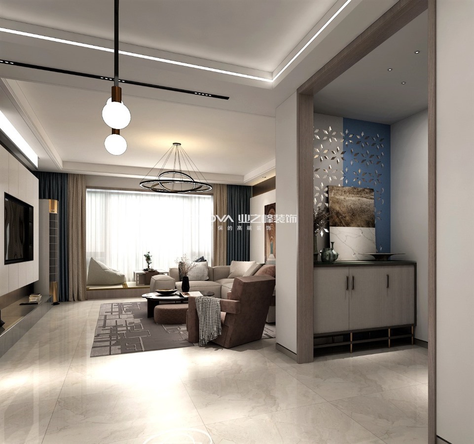 本案中采用了当下比较流行的电视背景柜的一个设计手法,增加了空间的展示功能以及立面造型效果,还原现代主义的实用性。