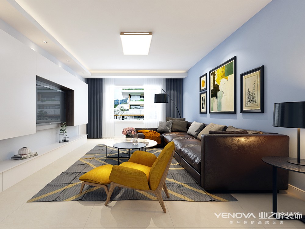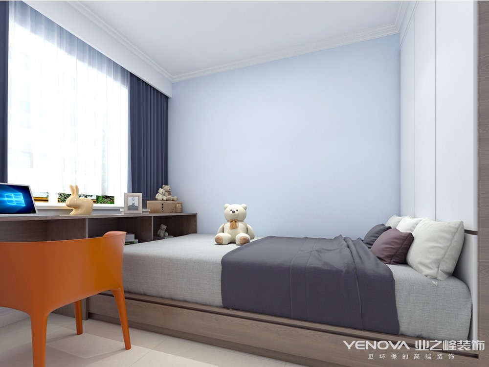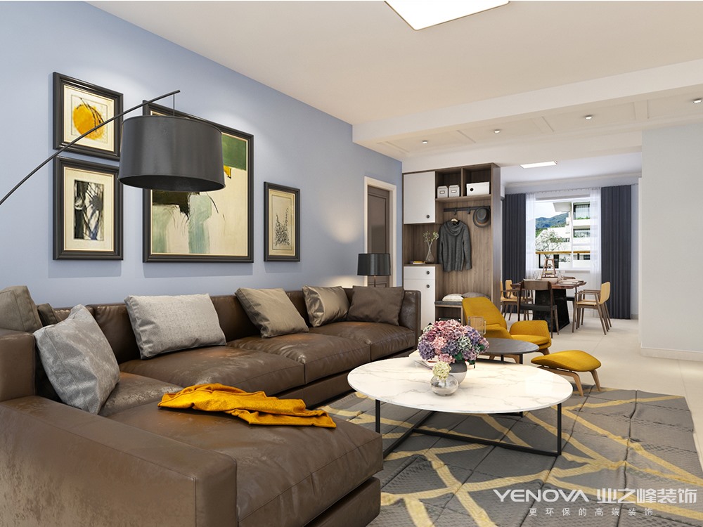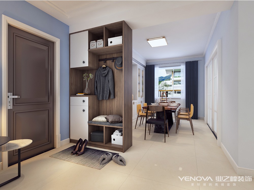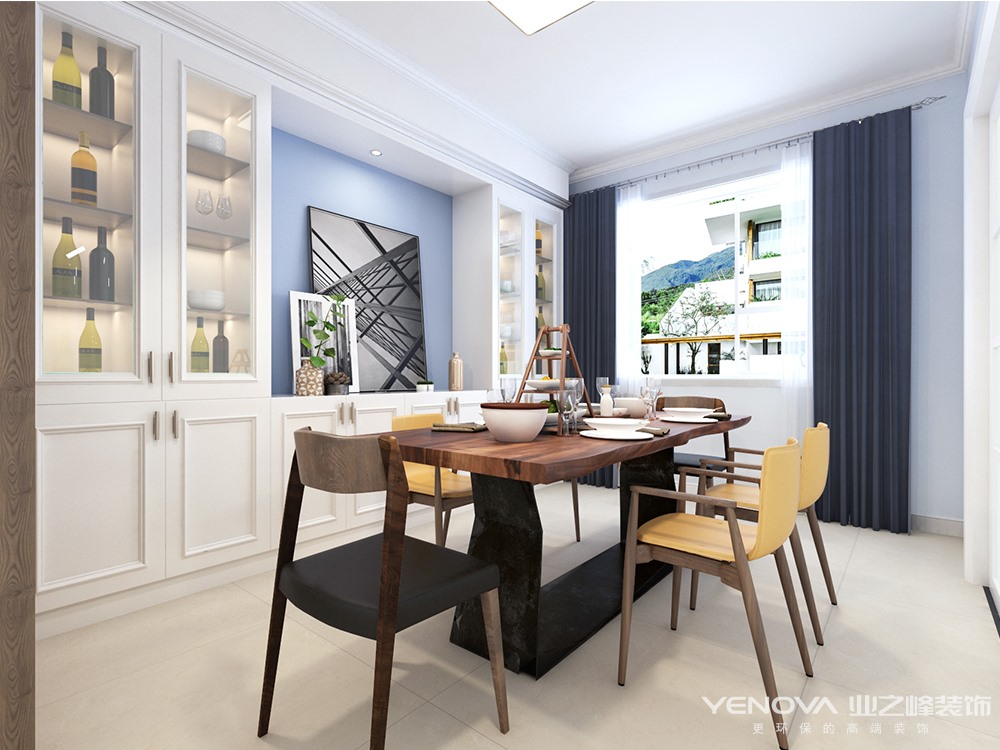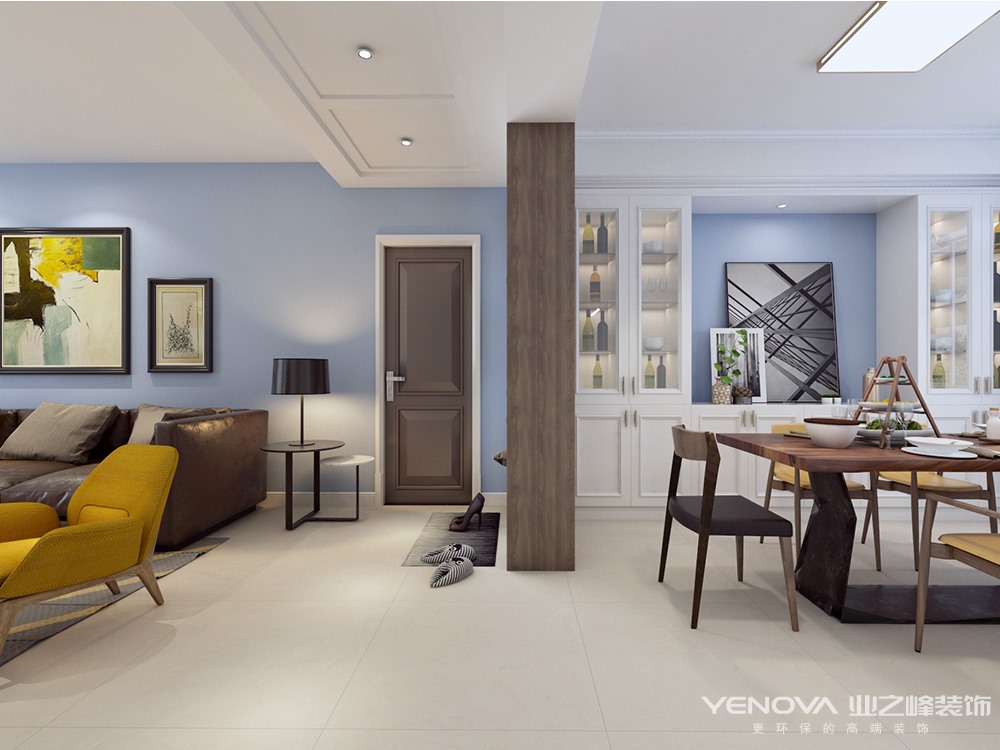 业主一家四口,两个小孩,妈妈喜欢清新温暖感觉的家,爸爸喜欢严肃干净利落的,在后期选择时候怎么把爸爸妈妈喜欢的东西融合到一起,所以我选整体用灰蓝色做基础色,地砖带点黄色来中和室内的气氛,橱柜选用白色与原木色作为一个调节剂,大面积使用白色柜子让整个空间既不偏向任何一方,同时都能接受的预留空间。顶面用简单造型来处理原上梁不规则问题。软装上采用深色家具也是考虑到后期小孩爱活动,单个家具选择纯色作为点缀,整体下来整个空间整洁而不冷,温暖而又温馨。