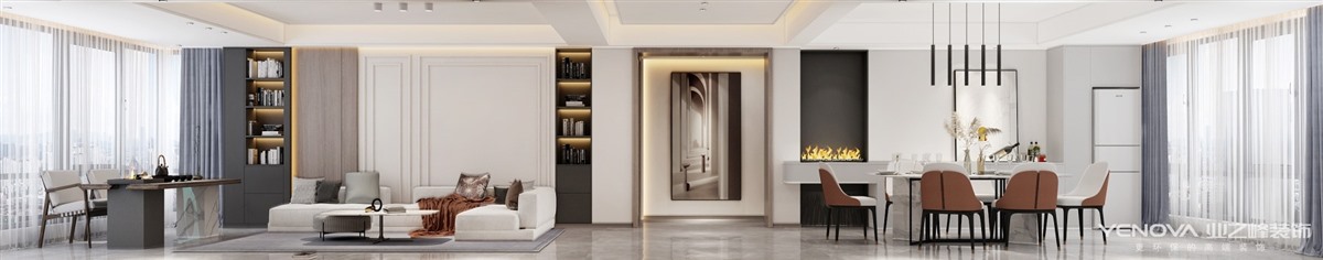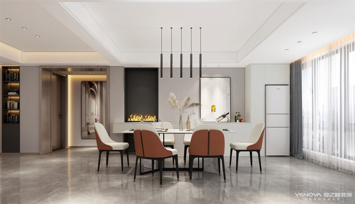 餐厅位于入户右手,在设计师考虑家庭成员数量,她通过摆放餐桌,餐桌背面增加一个壁炉造型,使餐厅更为独特,餐厅原生活阳台增加储物柜,使餐厅具有一定收纳功能。