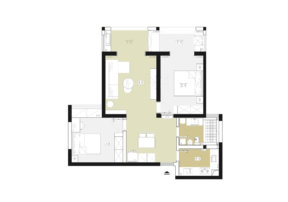 本案是鑫苑国际新城,二室二厅户型,本案空间结构并没有做过多处理,只将进门主卧室门口做了调整。