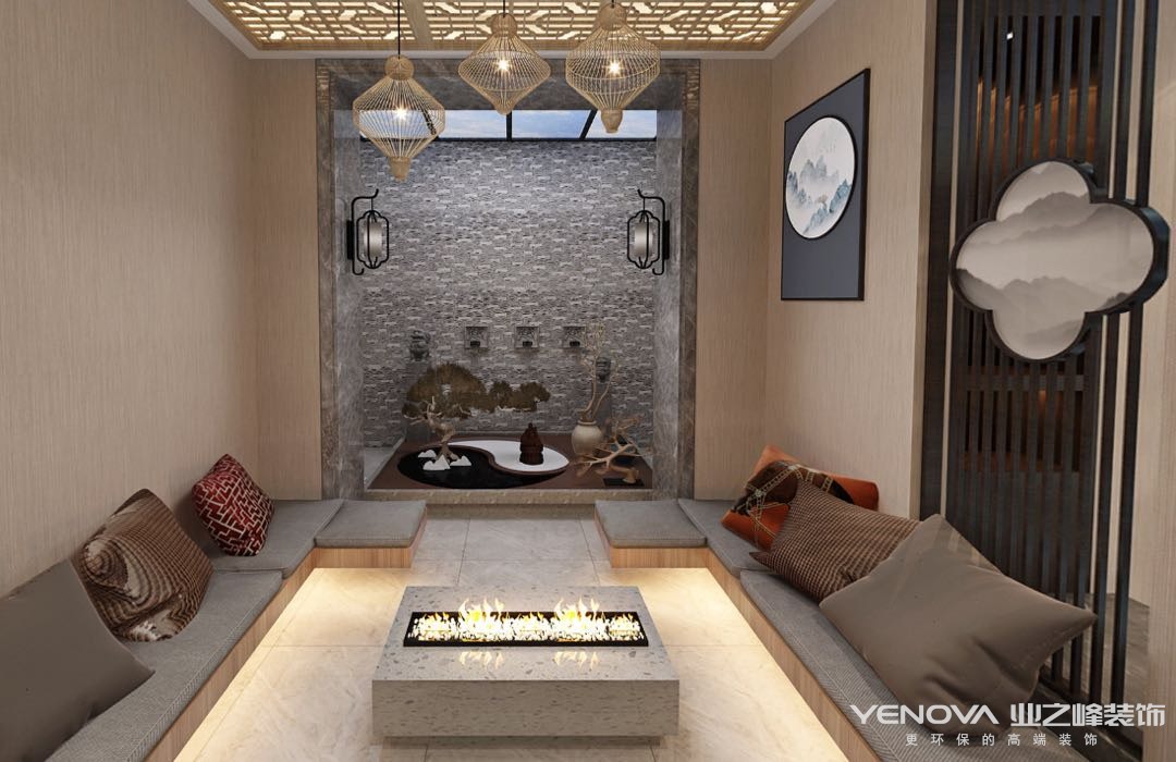 本案设计结合现代简约风格和传统中式风格,用各自的特点,来相互补充和完善,呈现出两者兼有,减少中式风格的沉闷和简约风格的浮动,让空间稳中有动,简中有繁。以现代人的审美需求来打造富有传统韵味的事物,让传统艺术在当今社会得到合适的体现,这种风格是对历史文化的传承,内涵东方美韵,淡而雅,整体格调与门外的山水相互映衬,深处自然,安逸,自由。
