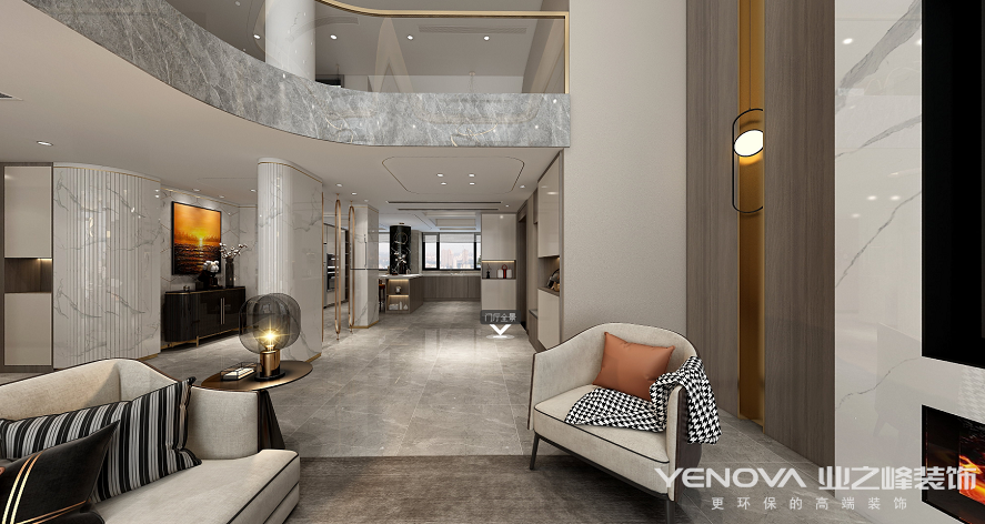整体空间的色彩大量使用了淡雅的灰色调,有浅灰和深灰之分,相互和谐搭配,令客厅具有很鲜明的色彩层次美感。再细细品味高级灰的分布,会发现每一处装点的都特别完美。浅灰顶面与墙、地面对比分明,给人舒适温馨的视觉感受,然后再用一盏大小圆形组合吊灯来进行空间装饰点缀,一下子就将现代品位家居的轻奢感渲染了出来,几何灯具既起到很好的装饰感又一点都不张扬,用在这里非常合适。