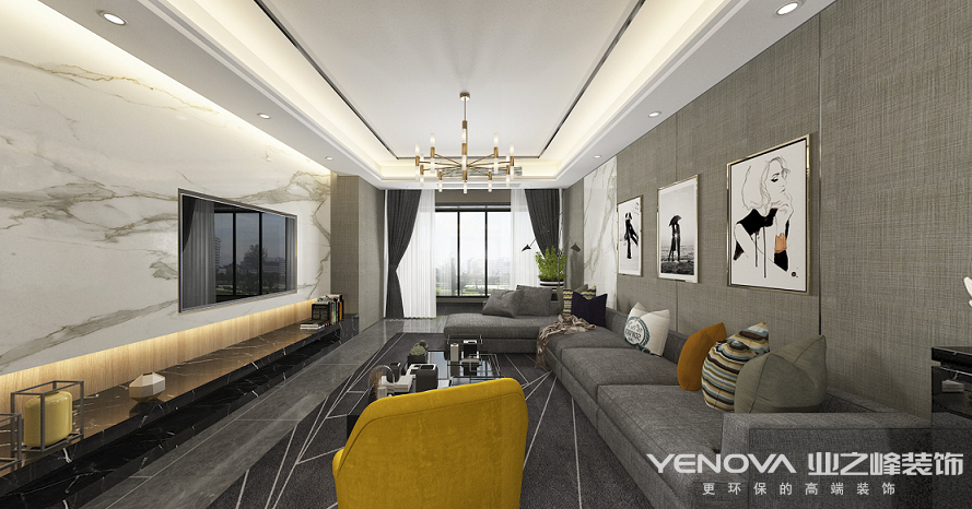 客厅的设计,整体空间的色彩大量使用了淡雅的灰色调,有浅灰和深灰之分,相互和谐搭配,令客厅具有很鲜明的色彩层次美感。再细细品味高级灰的分布,会发现每一处装点的都特别完美。浅灰顶面与墙、地面对比分明,给人舒适温馨的视觉感受,然后再用一盏大小圆形组合吊灯来进行空间装饰点缀,一下子就将现代品位家居的轻奢感渲染了出来,几何灯具既起到很好的装饰感又一点都不张扬,用在这里非常合适。