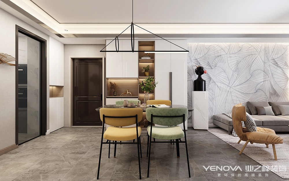 整体设计主要以简约舒适为主,在细节上运用了一些金属元素,来凸显整个空间该有的质感,在进门玄关处,我们也用了金属的摆件来奠定整个空间的基调。为满足业主的收纳需求,在客厅的阳台做了储物柜,封闭空间用来收纳不常用的物品,矮柜也可做为休憩休闲时的茶台。厨房与餐厅仅一步之遥,玻璃门总给人犹抱琵琶半遮面的效果,似乎朋友圈又多了个打卡拍照的场景。