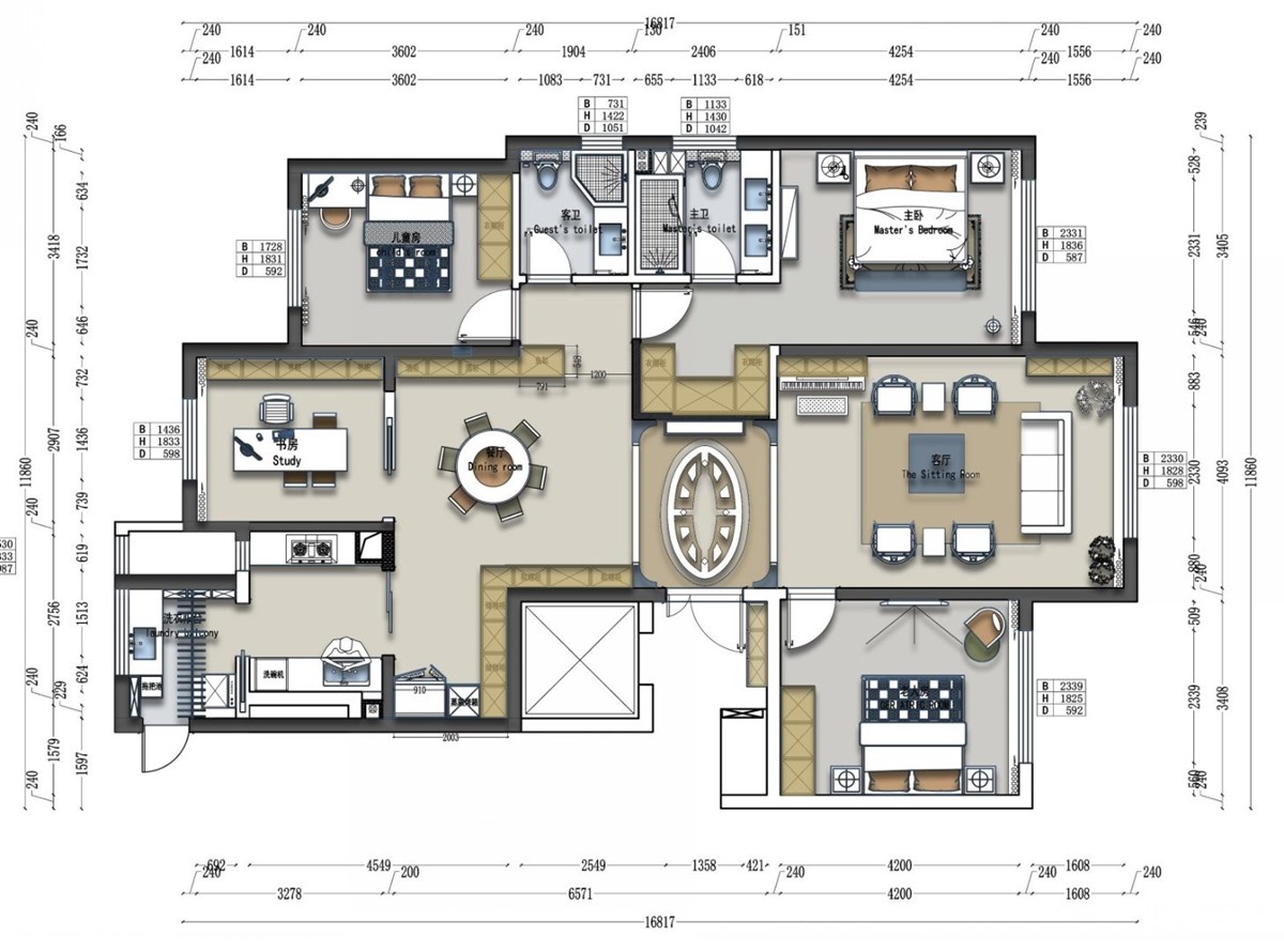 本案的业主是一对中年夫妇,和一个小孩,业主是非常典型的知识分子,沉稳内敛,追求高品质的生活,所以在设计风格上选择了格调高雅,造型简朴优美的新中式风格,以对称,平衡的概念调和室内生态,在装饰上选择天然的材料,运用中式的古典元素已及组合规律来营造禅宗式的理念,客厅以现代的装饰手法和家具,中式的装饰元素,呈现出古香古色和现代风格简单素雅的自然衔接,空间上把不必要的卧室,改造成一个极具禅意的书房,使其更能体现出业主的品味和追求。