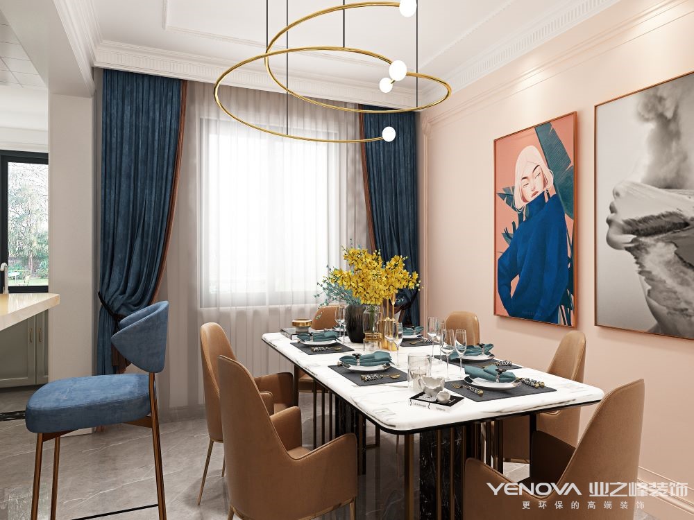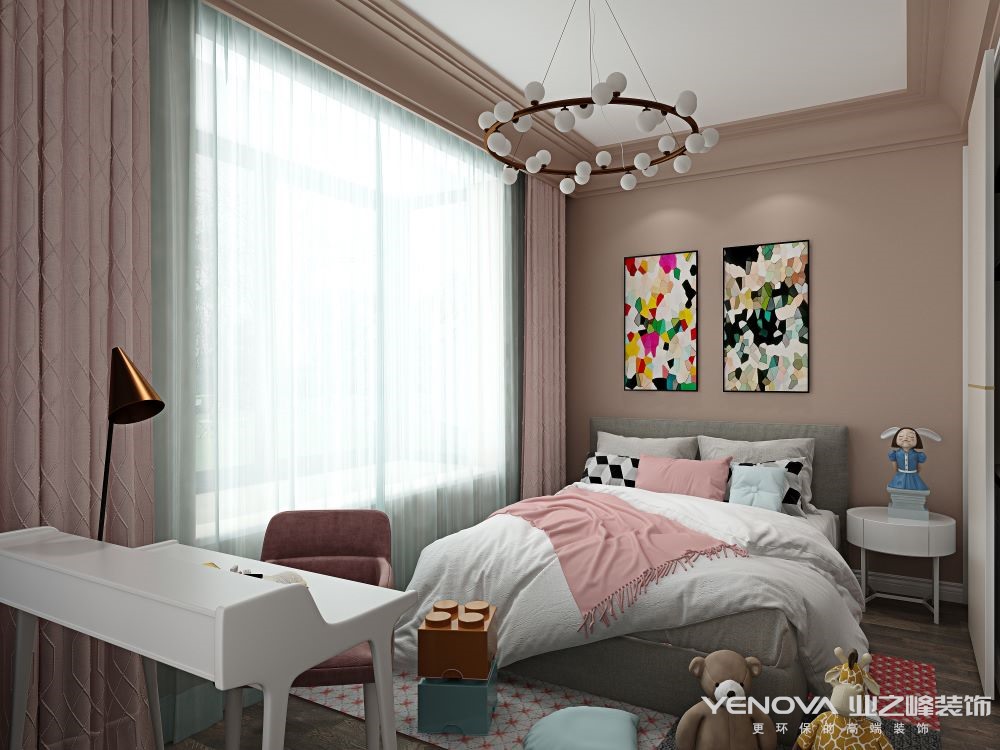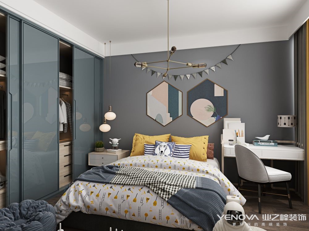 在色系的运用上,大部的色调以浅色作为主色调,稍微用亮色进行点缀。从视觉的角度上来说,浅色与深色相比,是一种较为舒适、柔和的色调,再加上少许的亮色点缀,会使整个空间既有和谐统一的感觉,又突出了视觉层次感,给空间增添许多生气和温度。