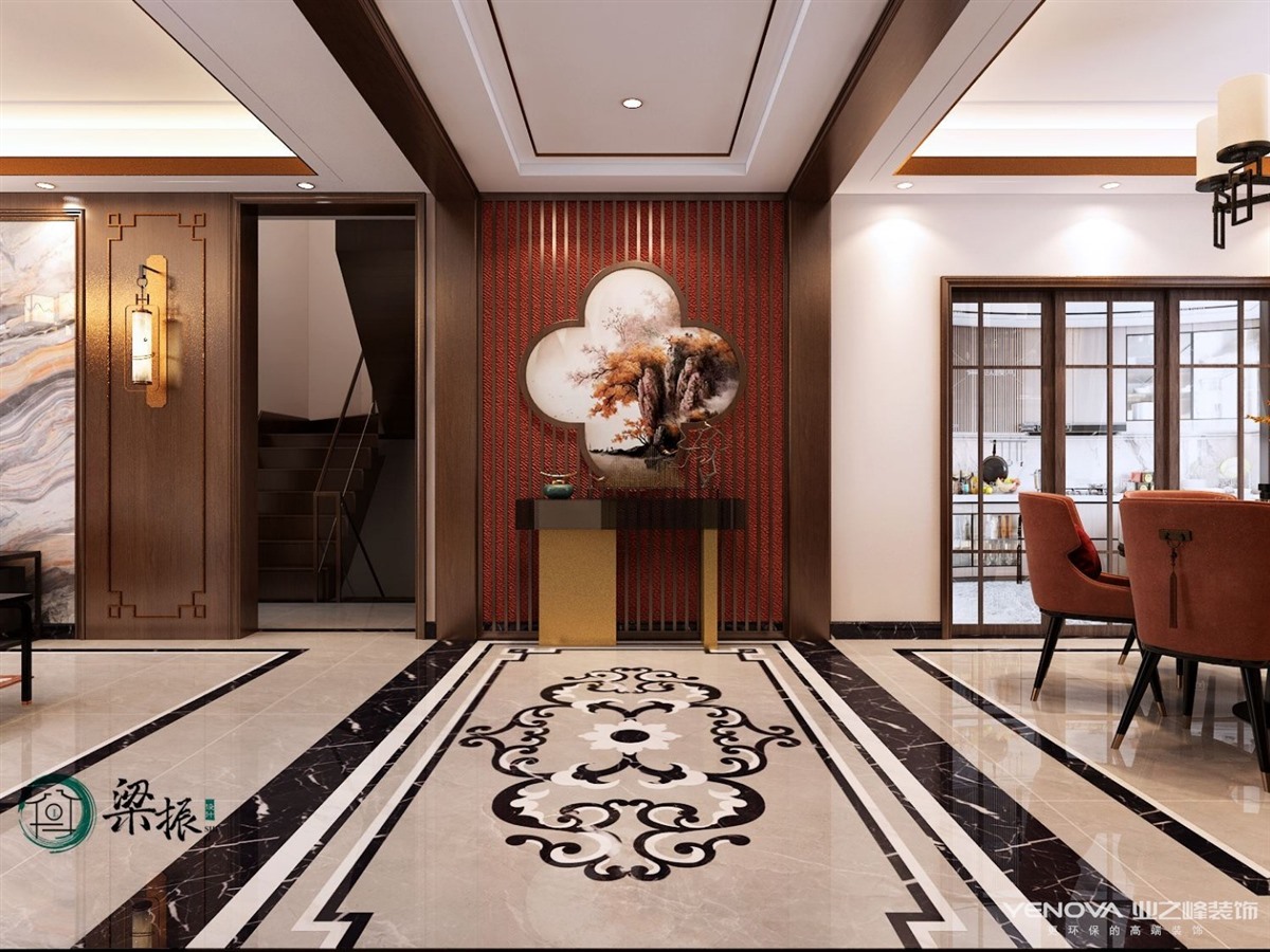思潮之一-。.新中式风格以符合现代人的生活习惯的室内居住空间现实舒适的居住生活。其内部空间布置,如客厅、餐厅、卧室、书房等完全体现现代生活要求。在室内色彩方面,本案以红色、暗红、琉璃黄、长城灰、玉脂白、水墨黑和木原色来打造新中式的气氛。除了保留中式的韵味外,还加了大理石、玻璃、灯带、等现代材料,使空间又包含了现代生活气息;光源上舍弃了以往的烛光环境,使用简洁几何灯具,