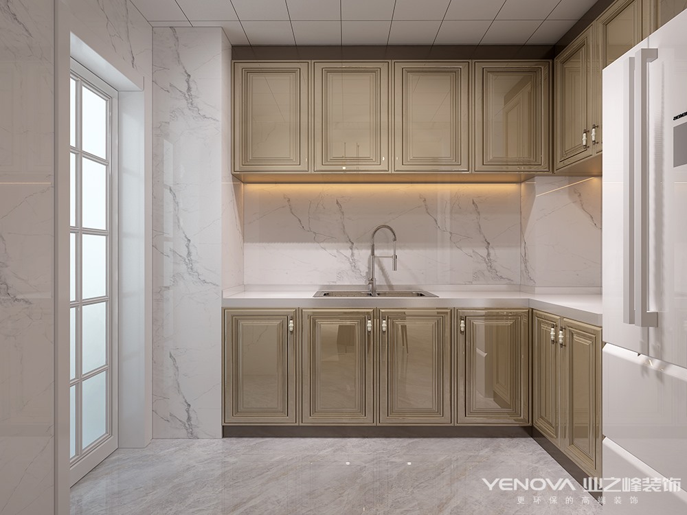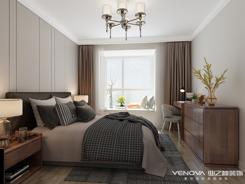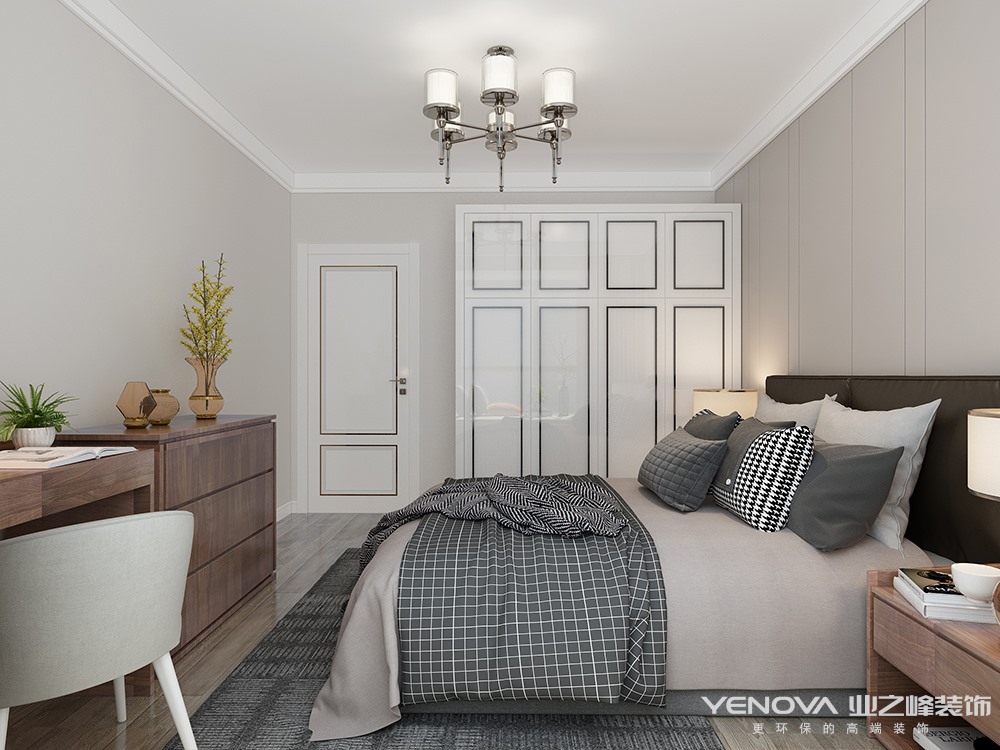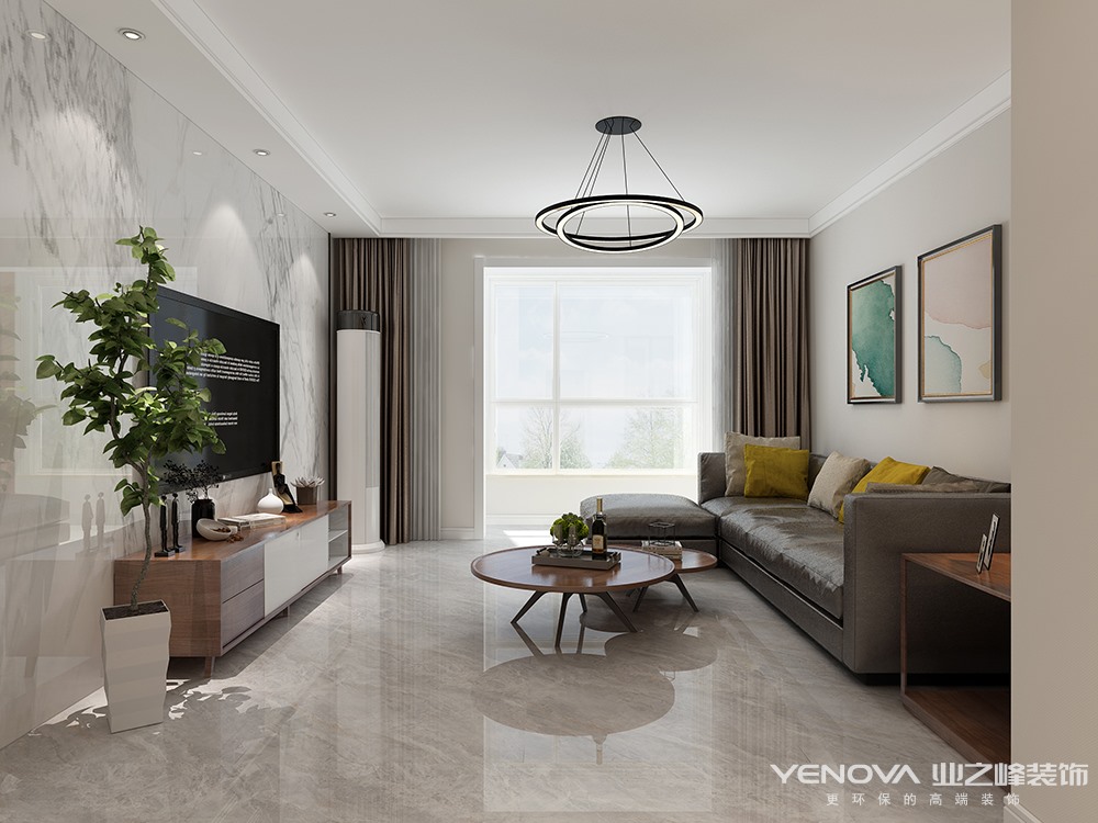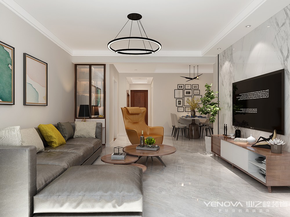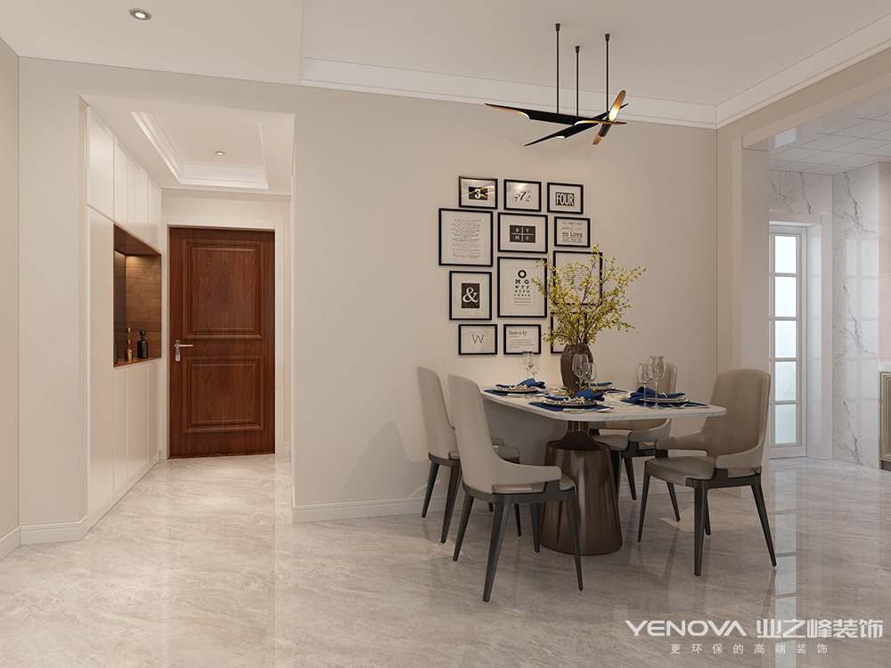 本案整体的风格为现代简约,客餐厅的公共区域使用大面积的素色壁布、白色乳胶漆做块面切分,辅以白色大理石,营造出明快简洁的背景。通过深色家具的色彩和质感,拉开了空间的对比和层次,再以极少量的软装和配饰作为点缀将现代风格的简洁素净、干练大方贯穿于整套设计中。