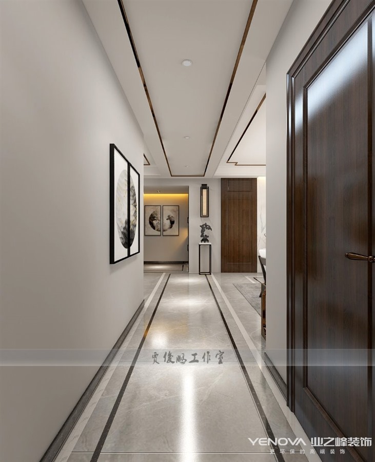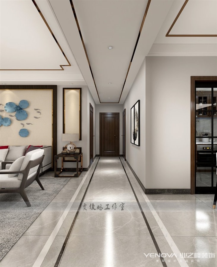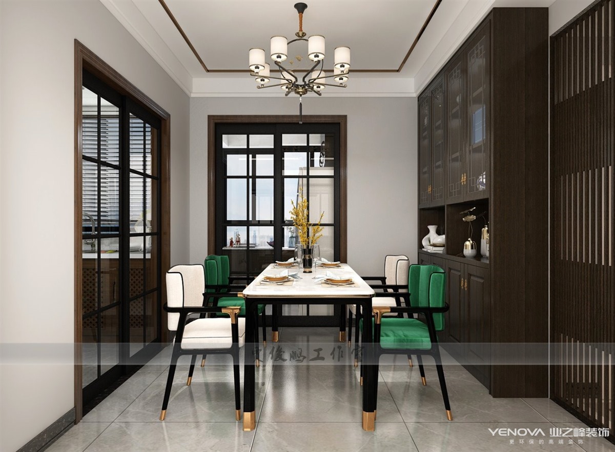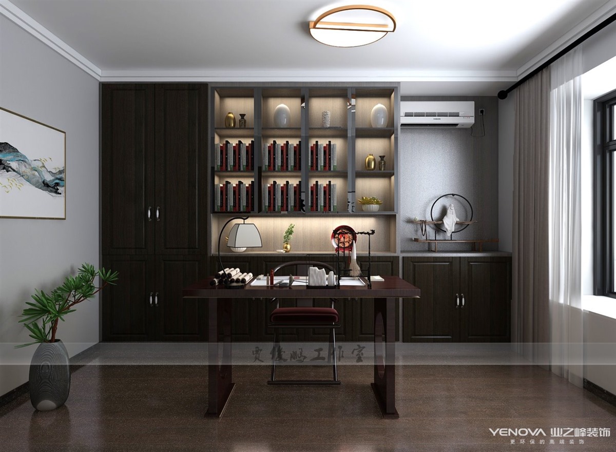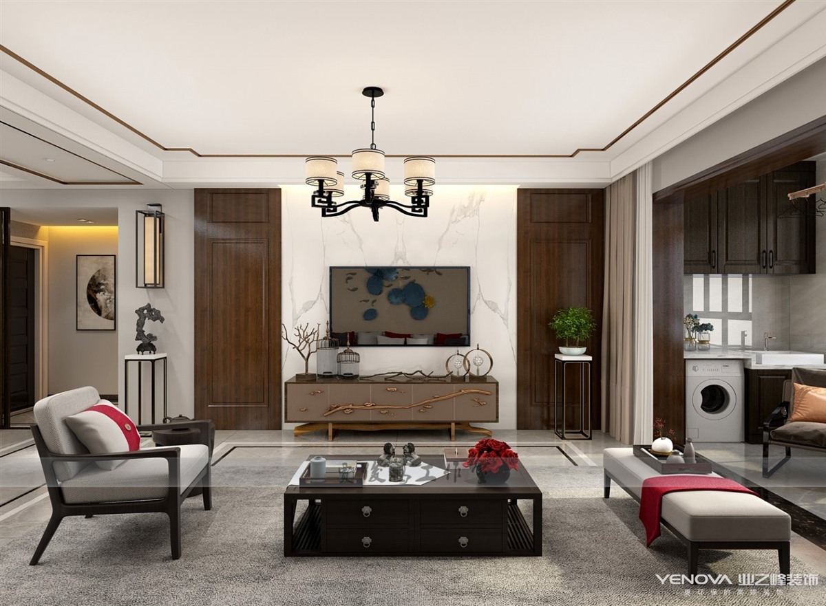 本案将文人雅士之闲情寄于生活中,以新中式的包容开阔之态接纳万物,选取乌金木材质的家具,隐去传统雕龙画凤,汇合现代手法,融诗语画情于一体,彰显东方的大气之姿。