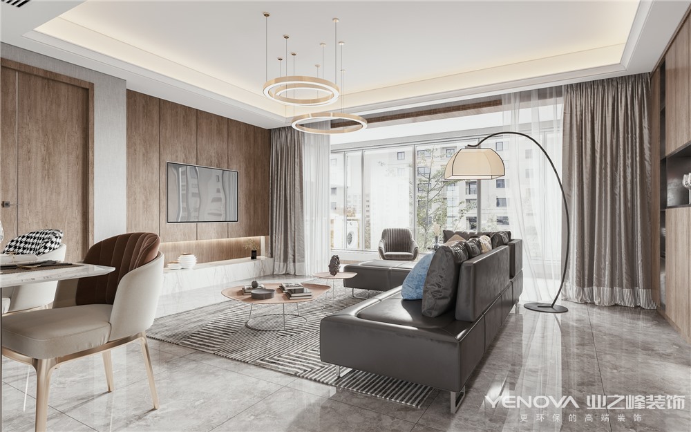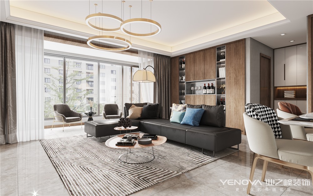 整体的家居颜色上面的运用,主要是以原木色为设计的主色调,少量深色的糅合,使色彩看起来明亮的同时又不失稳重,符合业主的年龄层次与社会地位。客厅的电视背景采用平板门柜体做整体电视柜,增加储物的同时又不会显得突兀累赘,同时也突出了电视背景,木饰面的运用显得家里稳重的同时又不繁琐,餐厅的位置设计了一面柜子,高柜与餐边柜的结合,柔和酒柜的装饰,既能满足业主对储物的需求又能不失美感。