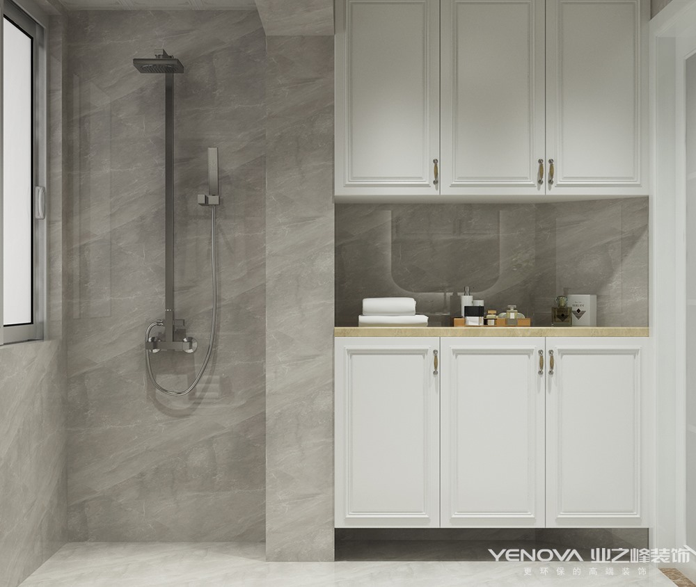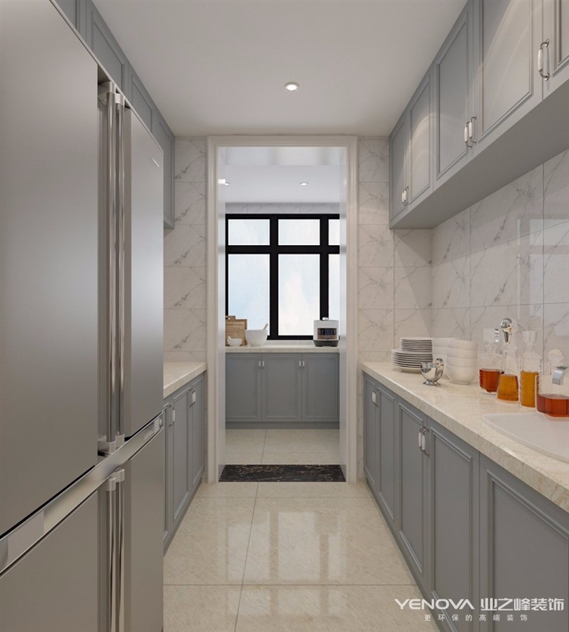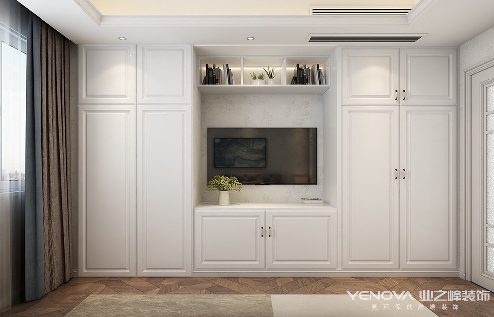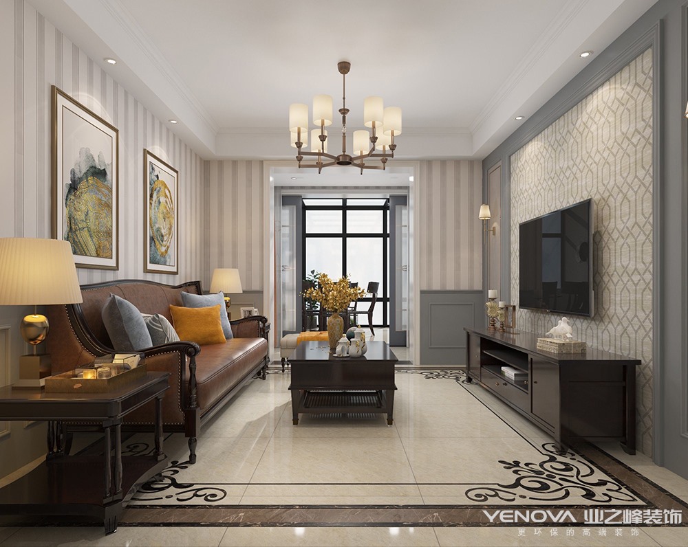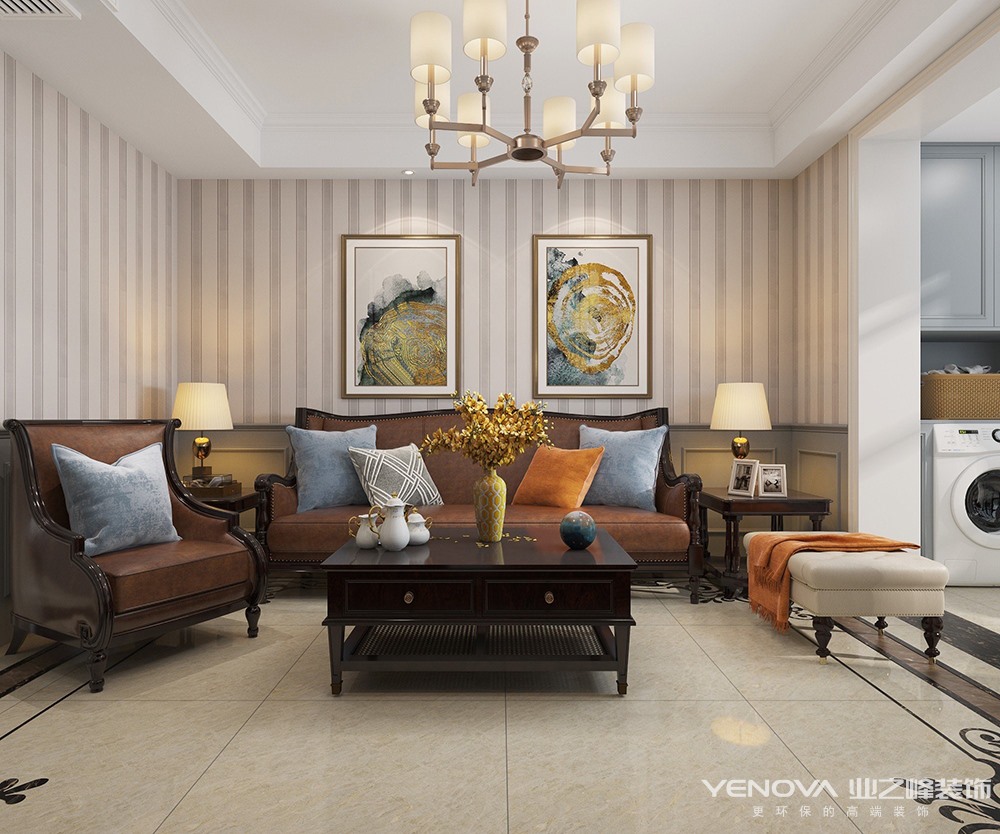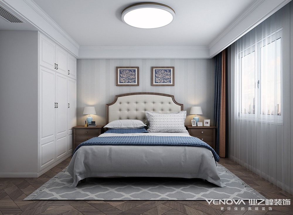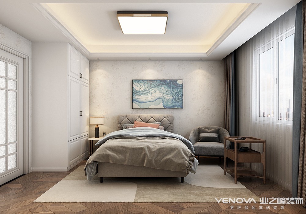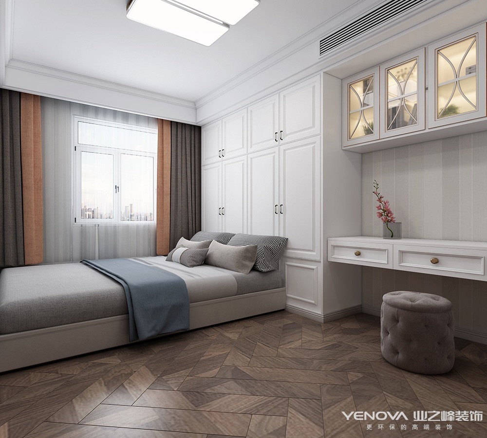 客厅作为待客区域,一般要求简洁明快,同时装修较其它空间要更明快光鲜,通常使用大量的石材和木饰面装饰。美国人喜欢有历史感的东西。把原来主卧空间改造成了客厅,中厨与西厨都是开放式的。客厅选择的是皮质的沙发,与墙面木质墙板形成材质感的对比,体现简美风格的自由。美式家居的卧室布置较为温馨,主要以功能性和实用舒适为考虑的重点。