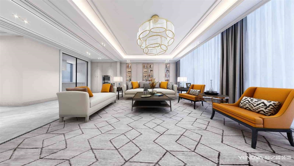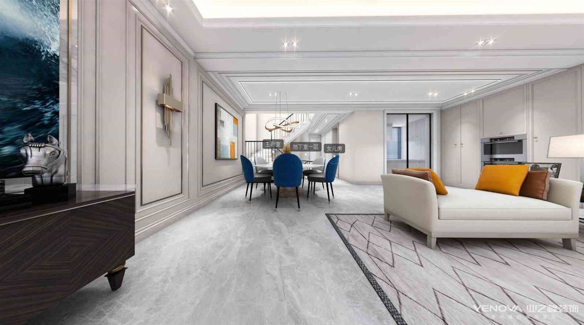家是舒适与美好,是我们内心的需求与向往,它绝非靠贵重的东西任意堆砌,它需要的是来自生活的想象,及最本质的追求。本案是一个五口之家,风格定位于美式轻奢,因欧陆奢华贵气融进崇尚自由的北美风气而诞生——正如精致考究的生活品质,邂逅自在舒适的人生态度。本案在基础色彩和元素的铺成之上,匠心别具,大量运用富于流动感的地面、墙面和挂画,两者结合之妙,如风过林,自然亲人。在给观者以极强艺术感染力的同时,作为日常生活空间,其与居者极富生机的灵感互动。